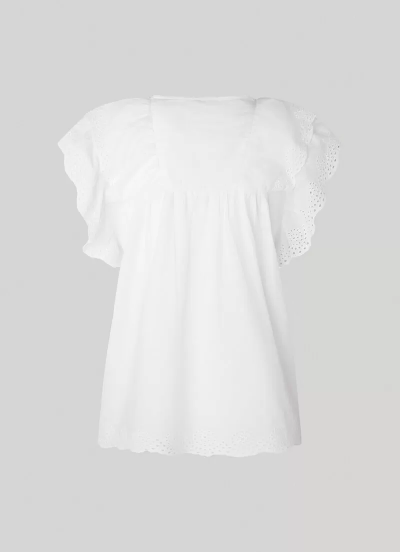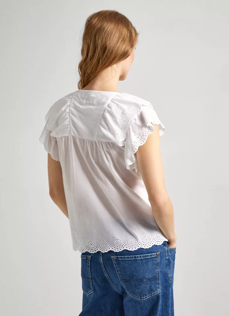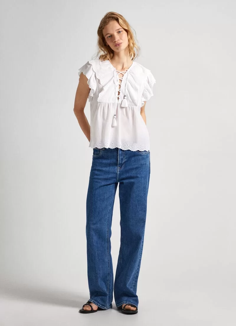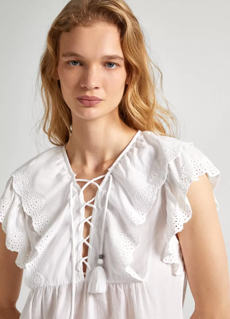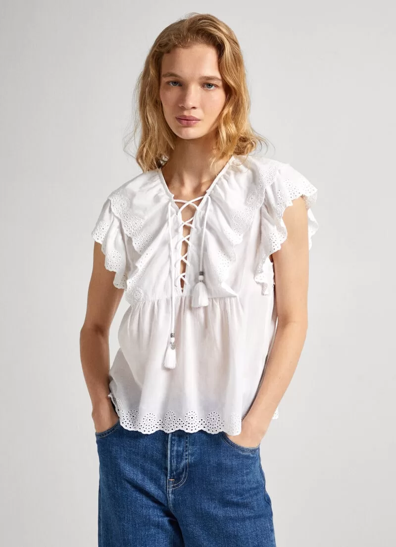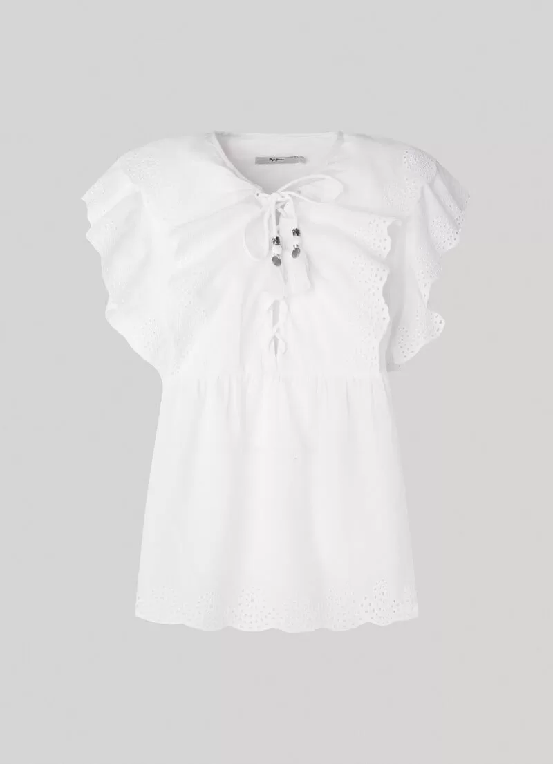 Blusa fluida de algodão. Decote em V com cordão transversal ajustável. Borlas decorativas no cordão. Manga borboleta com detalhes abertos. Folhos com detalhes abertos na parte frontal. Cor lisa. Bainha com detalhes bordados. COMPOSIÇÃO: 100% Algodão.