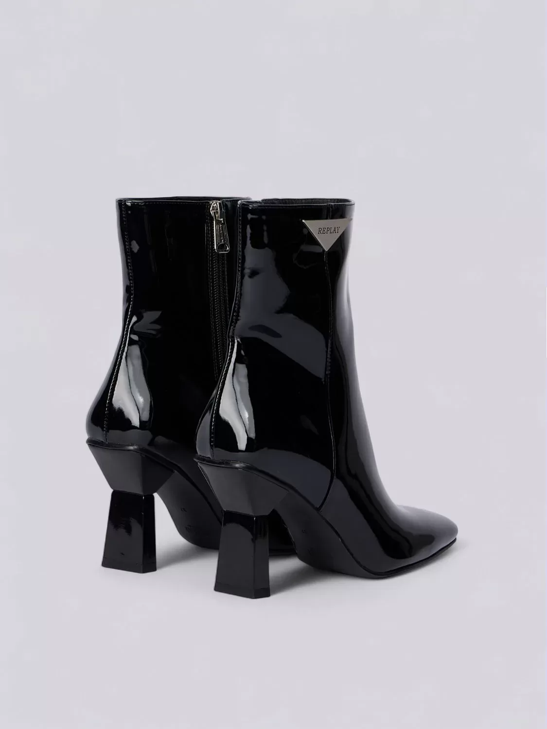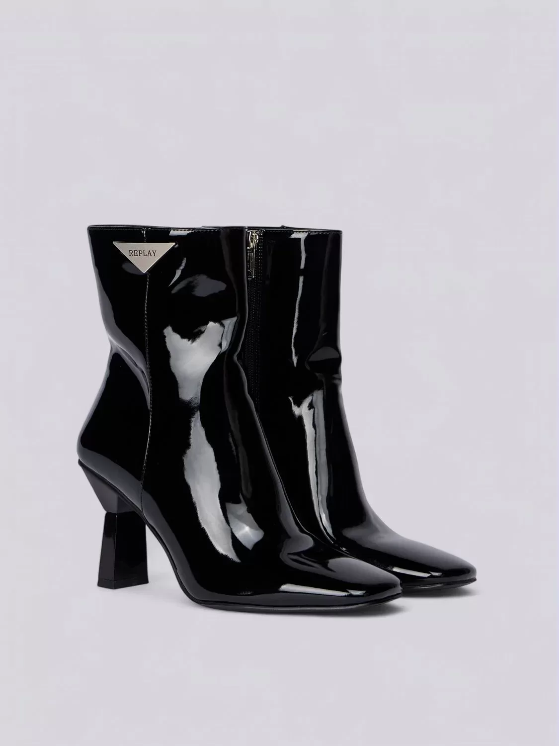 Botas de cano curto Marthe Patent com bico fino, confeccionadas em PU com efeito envernizado e com o logotipo triangular metálico na lateral. Salto geométrico de 8 cm e palmilha Ortholite® confortável.