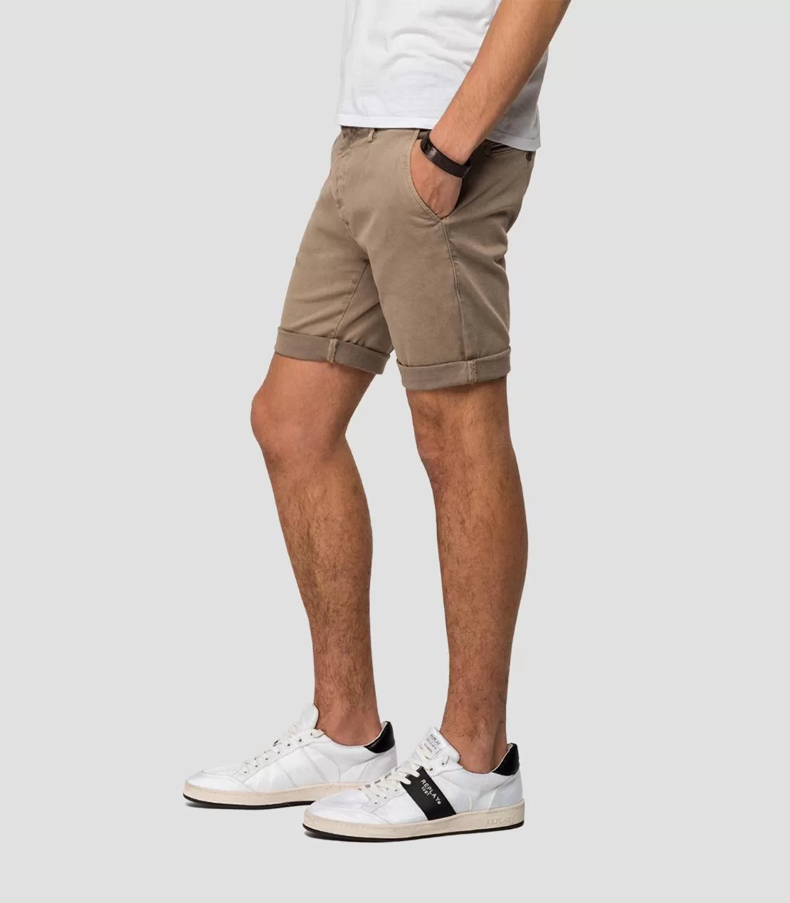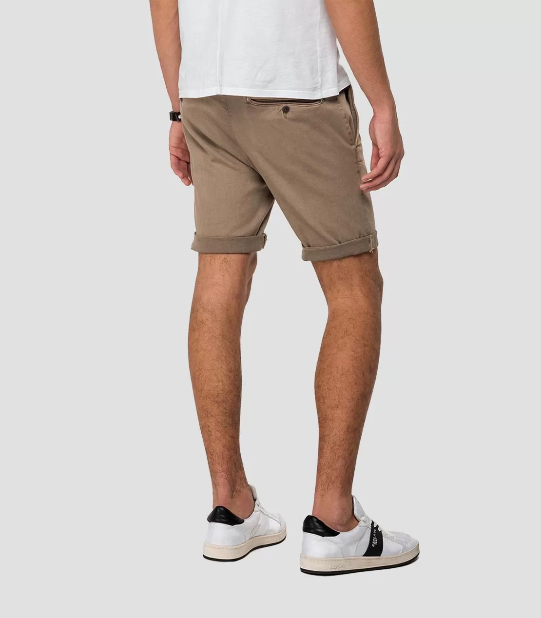 Calção chino slim fit para homem em denim Hyperflex reformado de 11,5 oz, peça de roupa de cor antiga tingida e stonewashed. Cinco bolsos, braguilha com fecho e botão, bolso para moedas com botão aplicado, dois bolsos de debrum com botão na parte de trás, etiqueta em tecido com logótipo REPLAY ESTABLISHED 1981 na parte de trás do cós. Hyperflex™ é a tecnologia inovadora que combina o autêntico visual denim com extrema liberdade de movimentos e conforto absoluto.