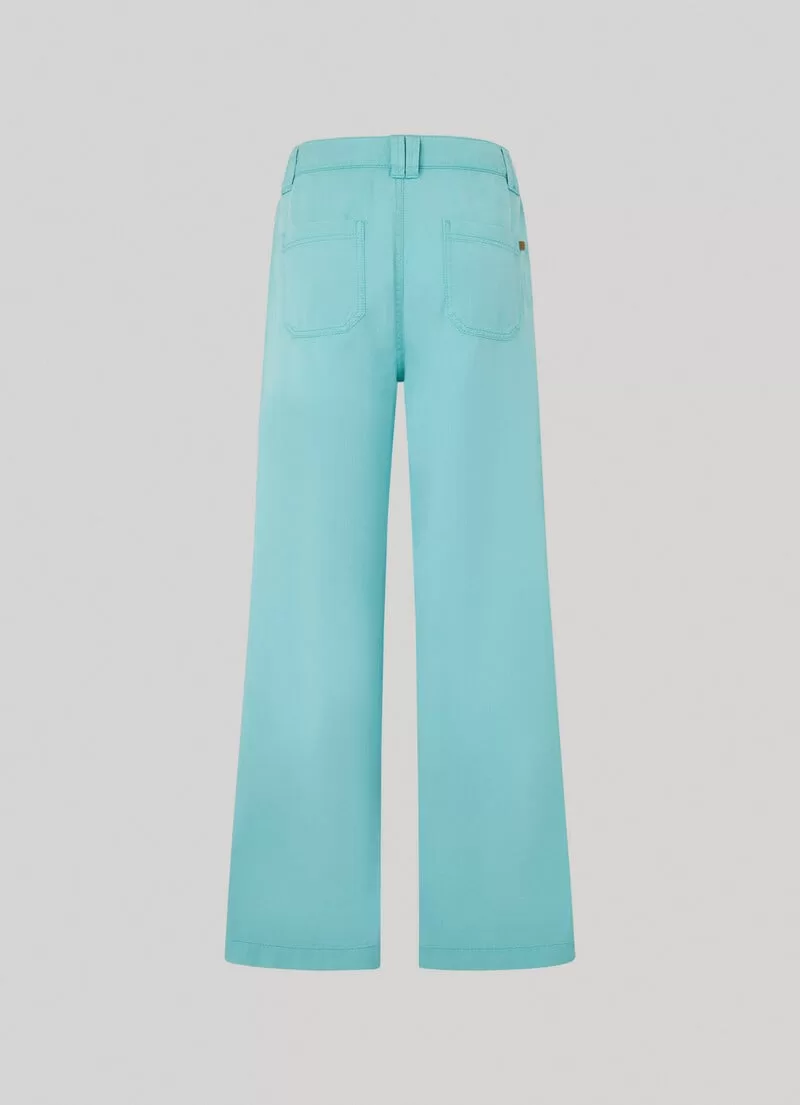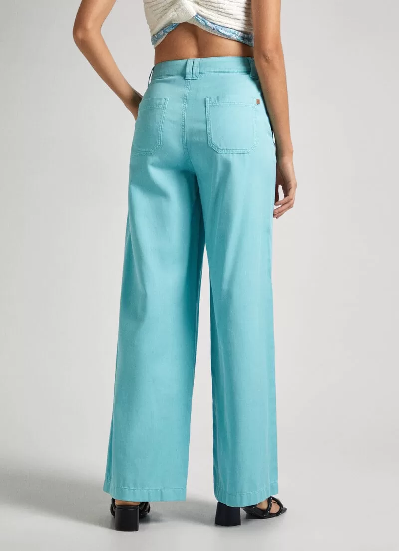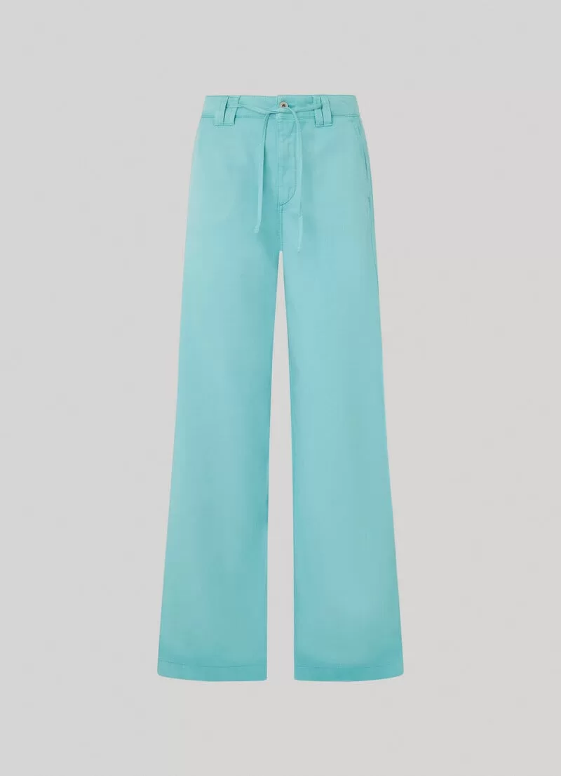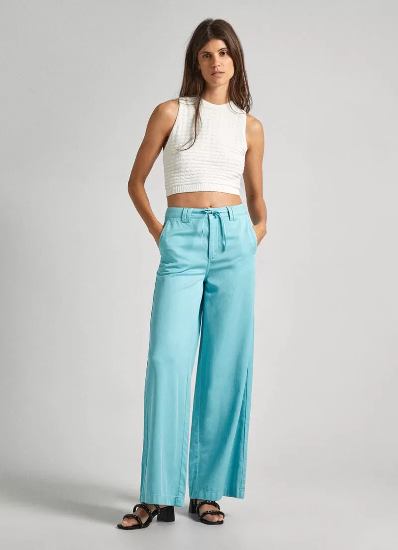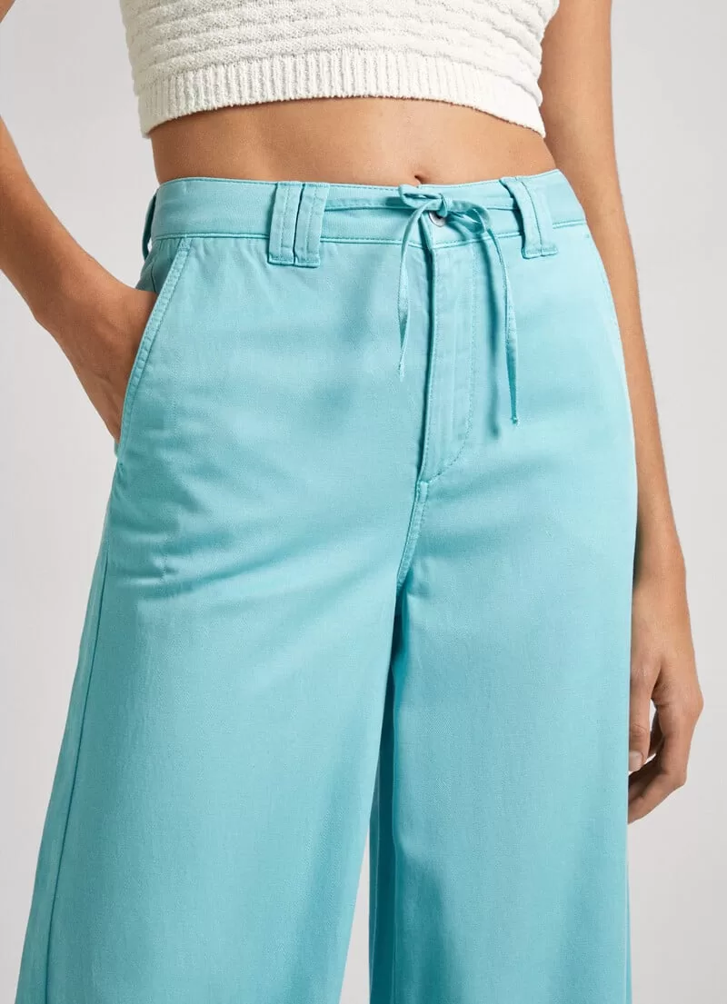 Calças Palazzo em tecido de algodão e tencel. Cintura com cordão ajustável na parte interna. Bolsos laterais. Braguilha com fecho de correr. Presilhas para cinto. Bolsos de patch traseiros. Etiqueta com logo PEPEJEANS no bolso traseiro. COMPOSIÇÃO: 51% Cotton, 49% Lyocell.