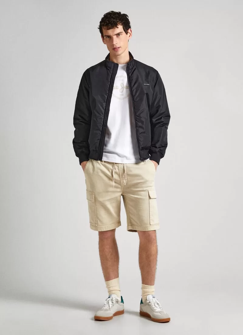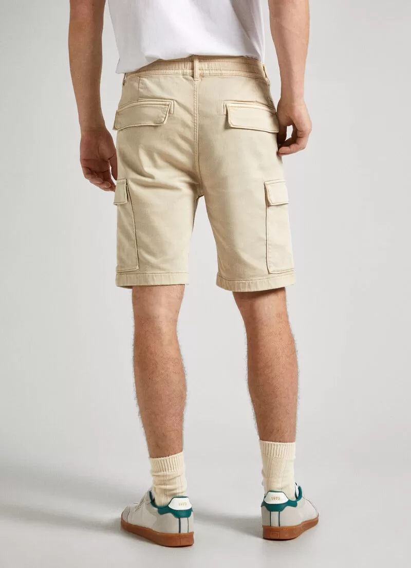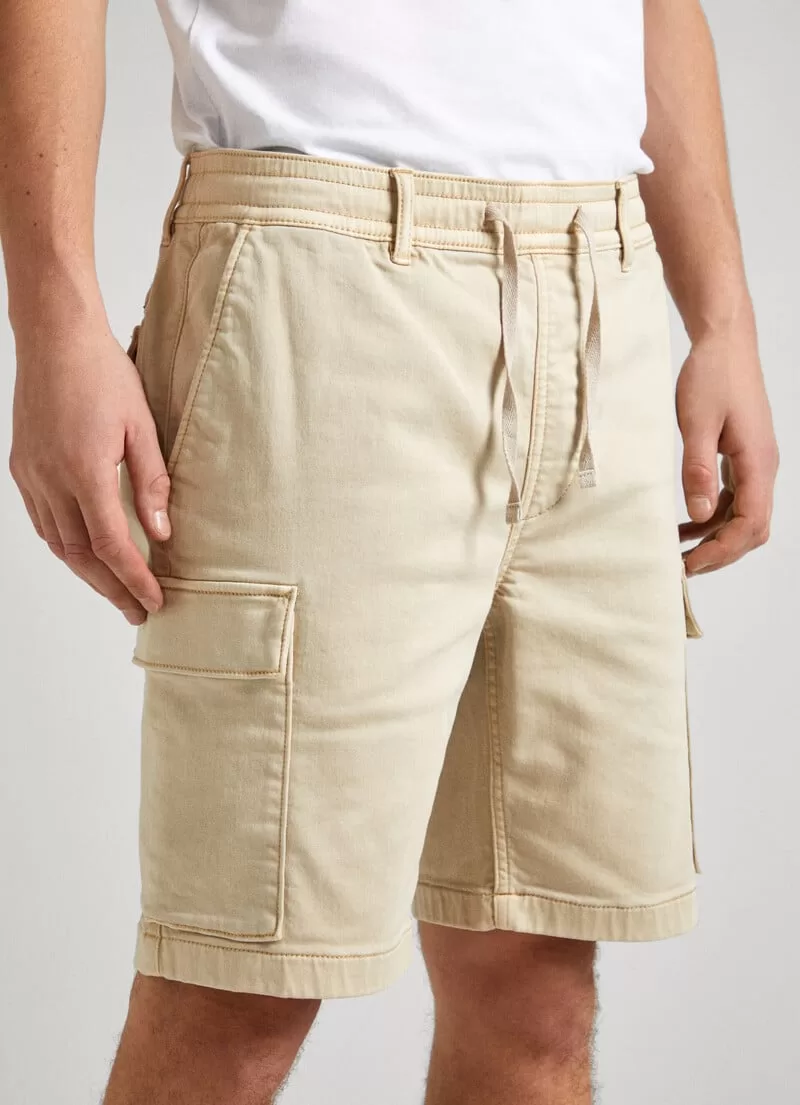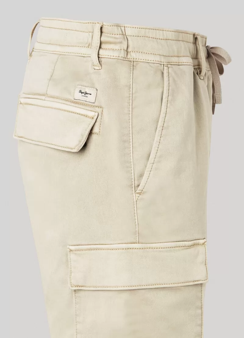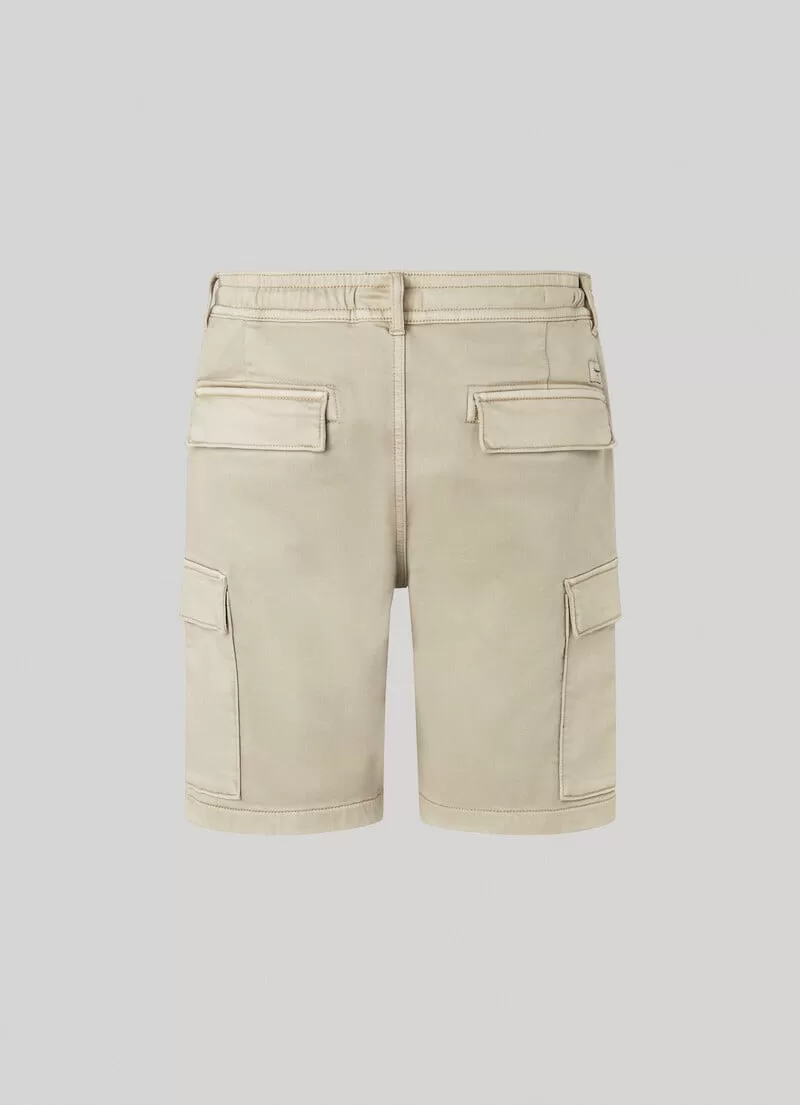 Calções em tecido de algodão elástico. Slim fit. Cintura elástica com cordão ajustável. Bolsos italianos. Peça com tingimento e lavagem. Bolsos cargo laterais com aba. Bolsos de aba traseira. Etiqueta com logo PEPEJEANS no bolso traseiro. COMPOSIÇÃO: 70% Algodão, 28% Poliéster, 2% Elastano.