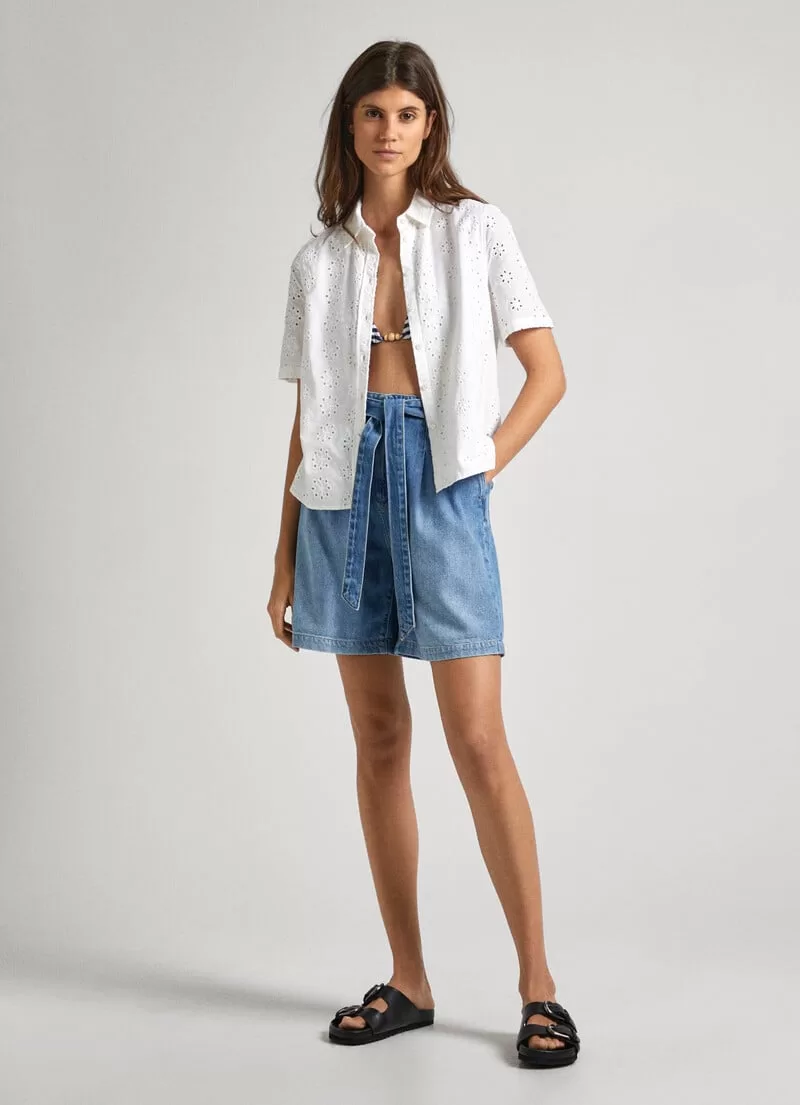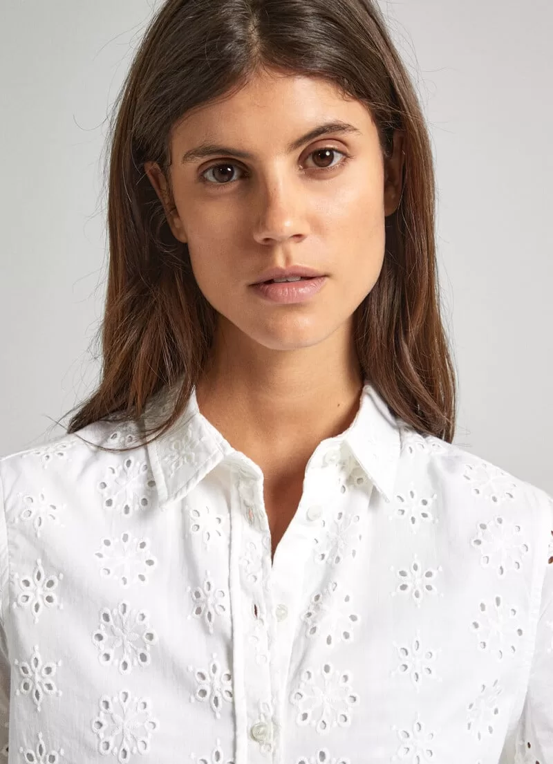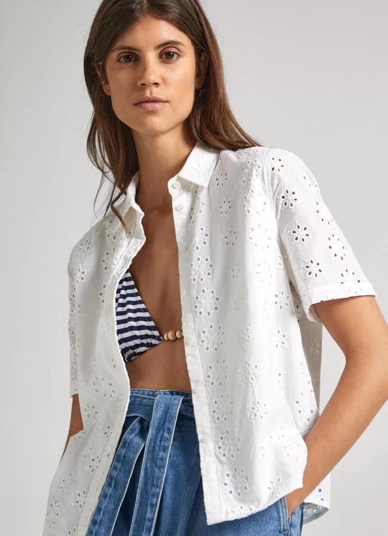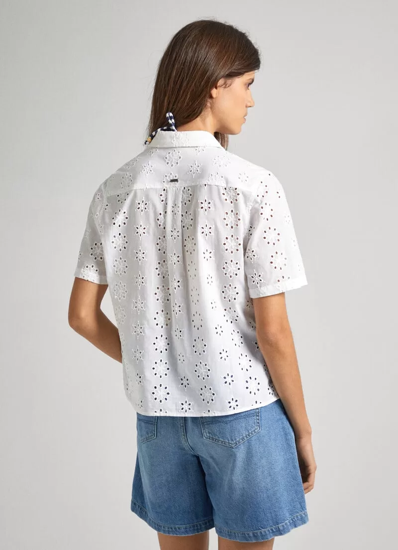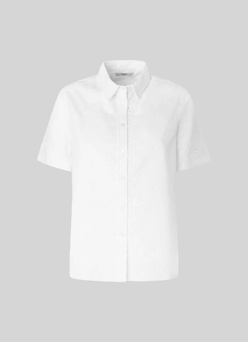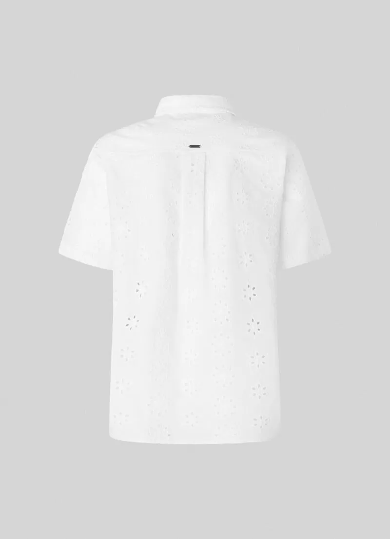 Camisa de popelina e algodão. Manga curta. Colarinho clássico. Detalhes bordados all over. Fecho frontal abotoado. Placa metálica com logo PEPEJEANS na parte de trás. COMPOSIÇÃO: 100% Algodão.