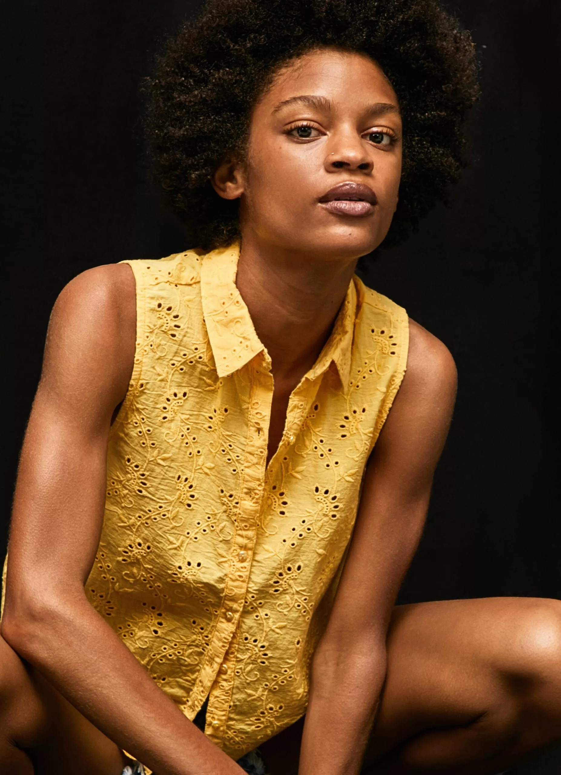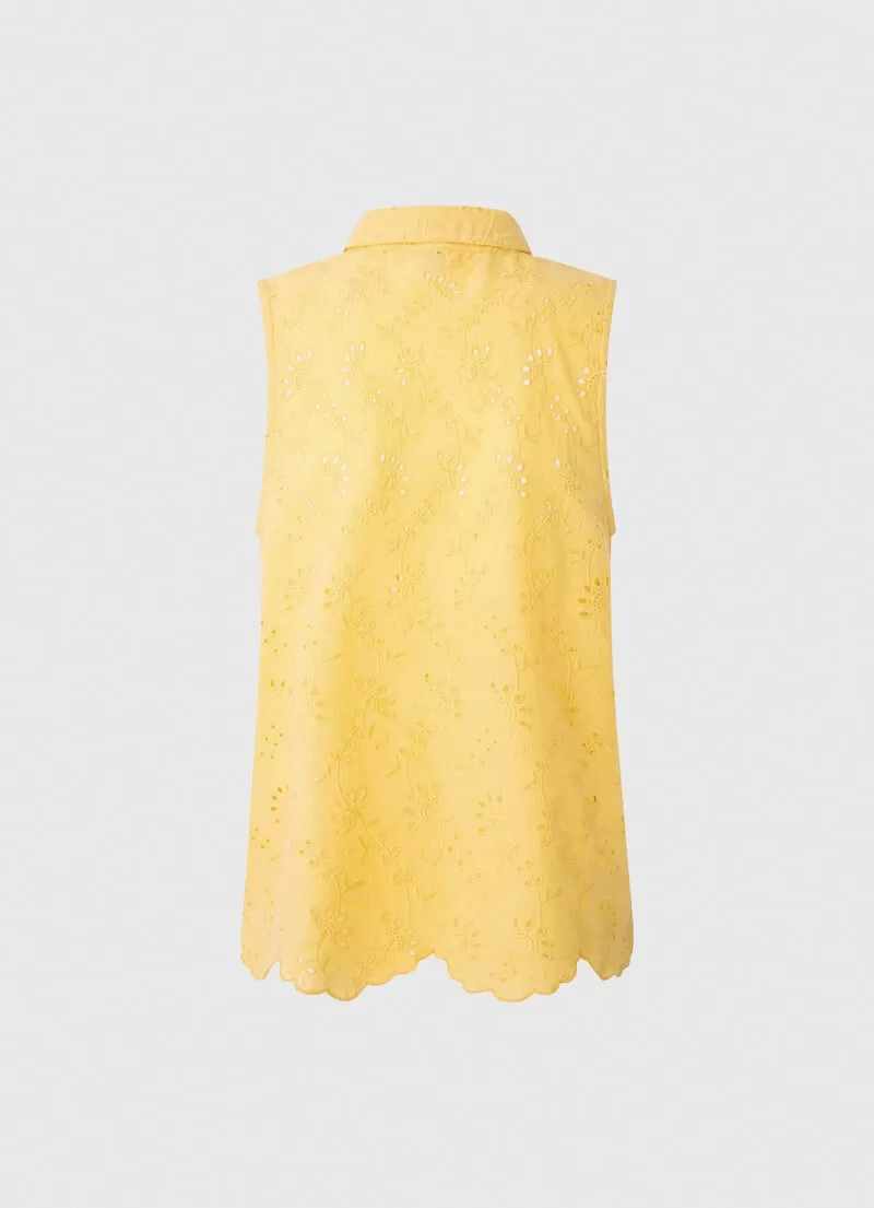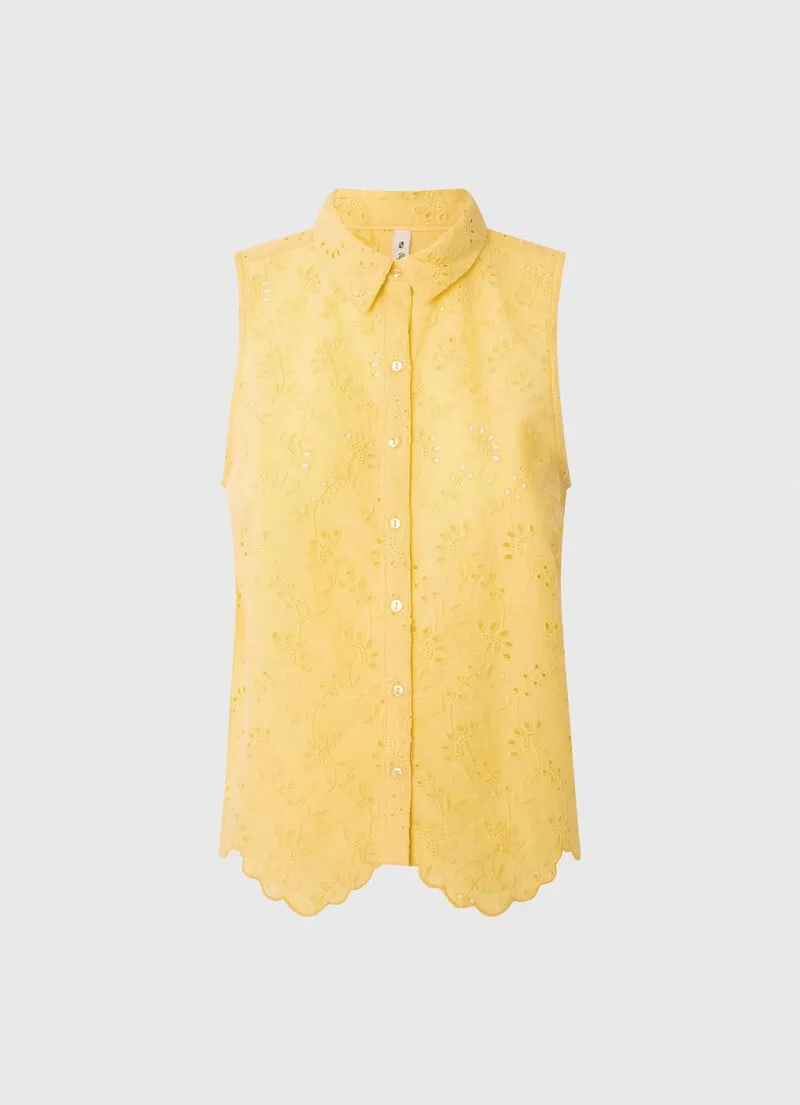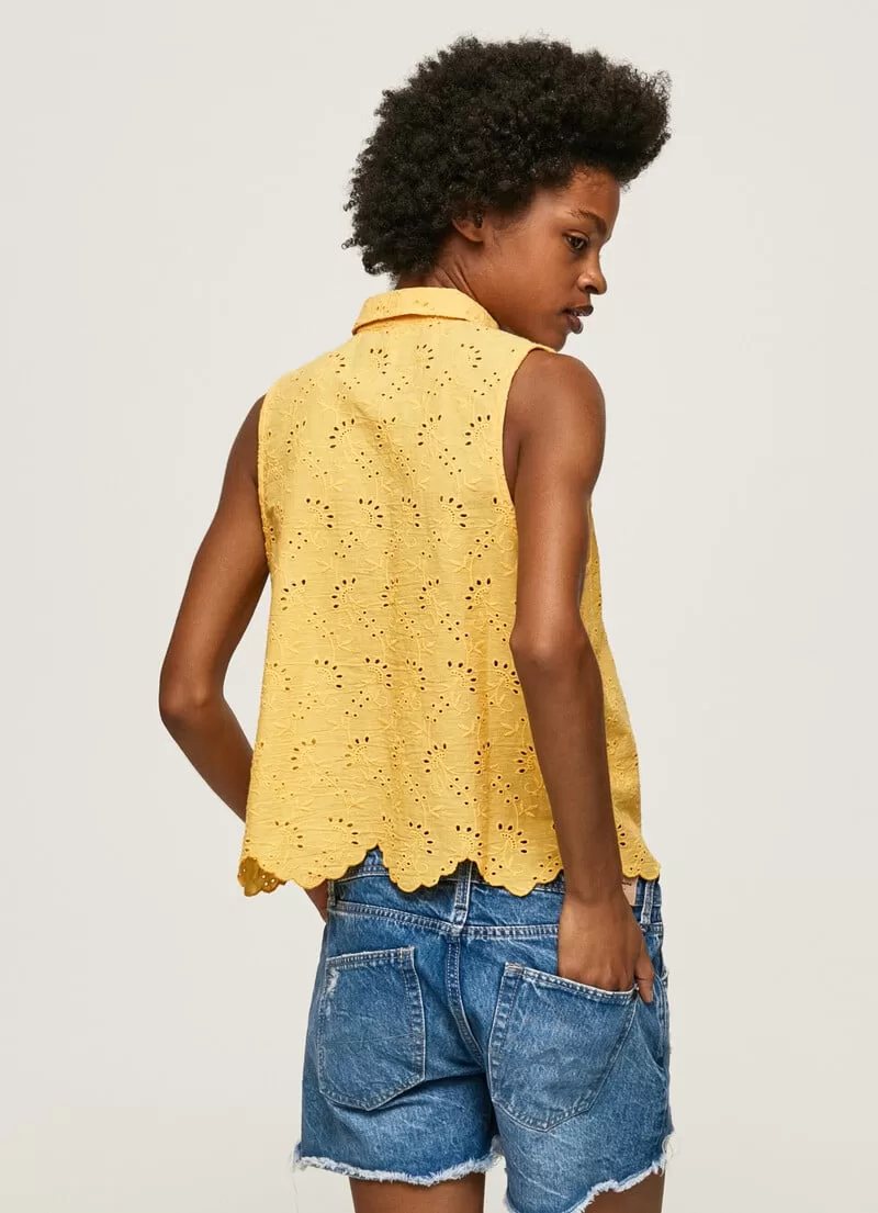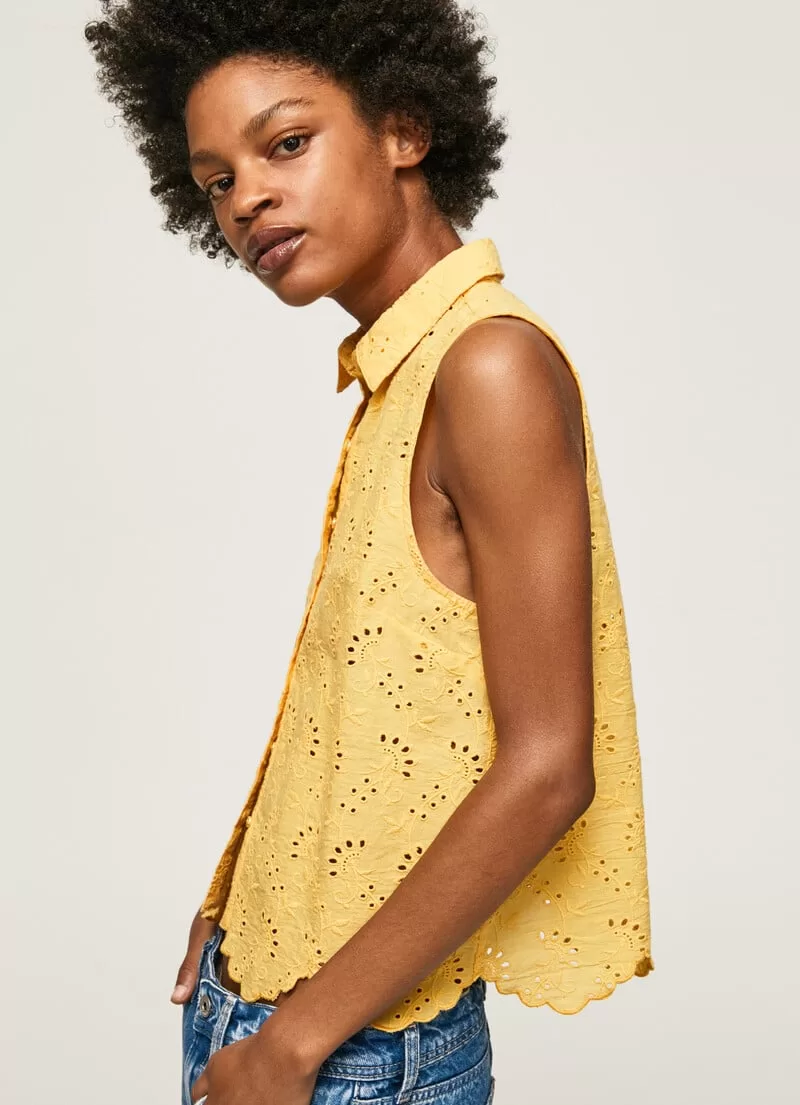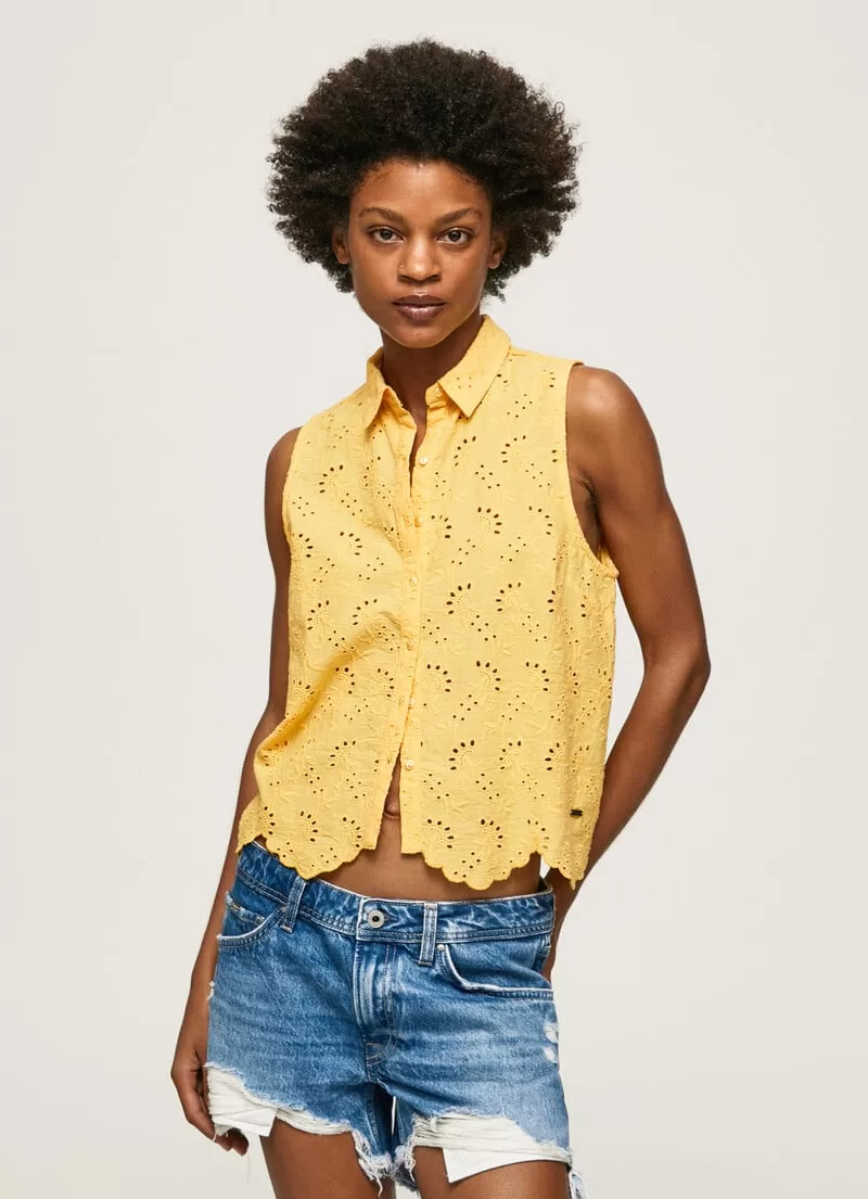Camisa em tecido com ilhós Cropped fit Manga única Fecho central com botões Detalhes bordados all over Barras onduladas na bainha. COMPOSIÇÃO: 100% Algodão
