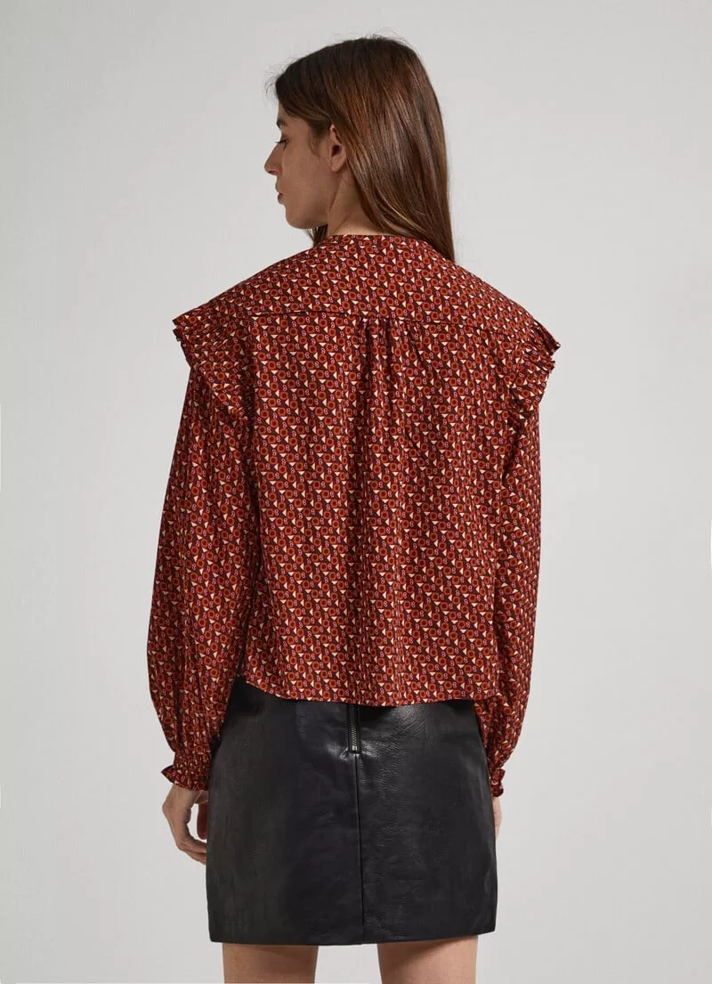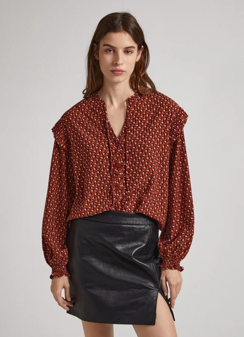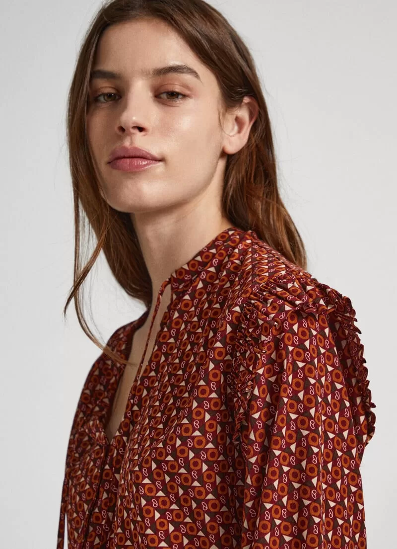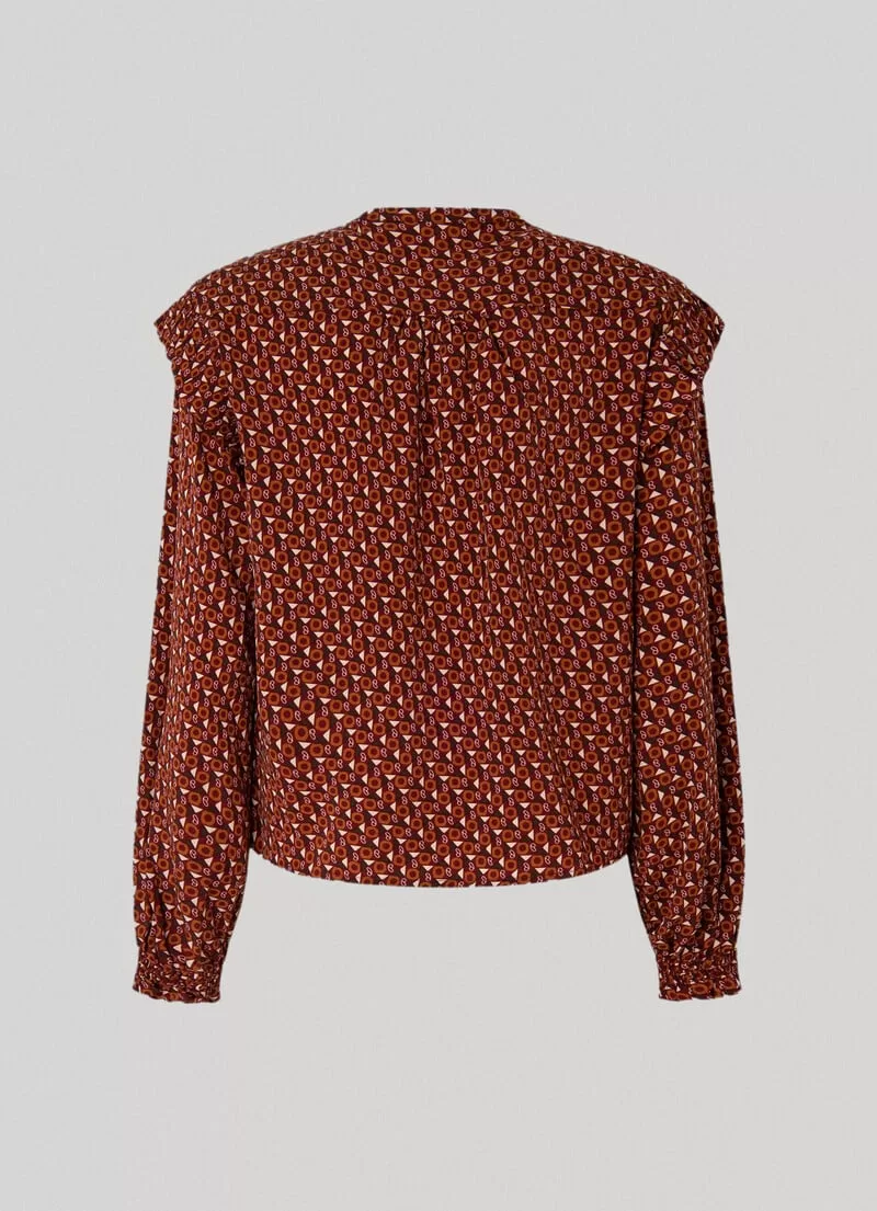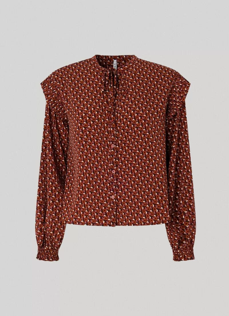 Camisa em tecido macio e leve. Decote redondo com cordão de ajuste Manga comprida levemente abaloada Decote buraco de fechadura Folhos plissados nas mangas Padrão geométrico com detalhes da marca Punhos elásticos com detalhes plissados. COMPOSIÇÃO: 100% Poliéster