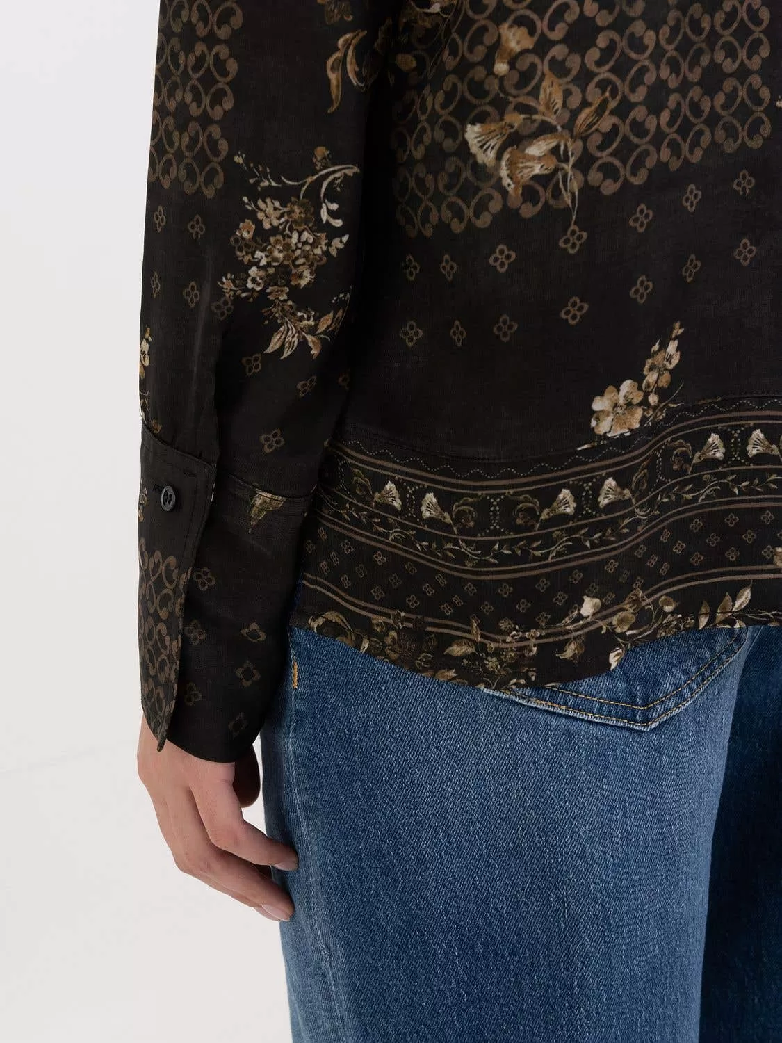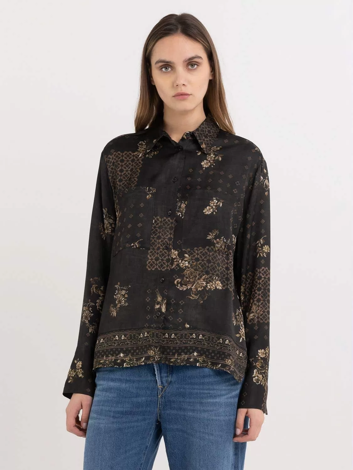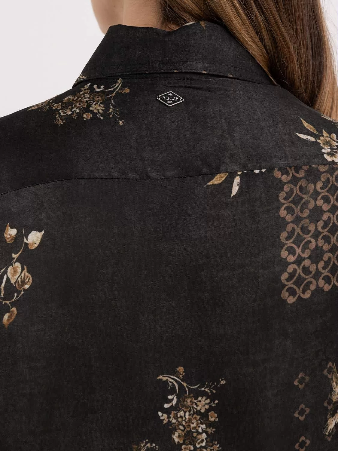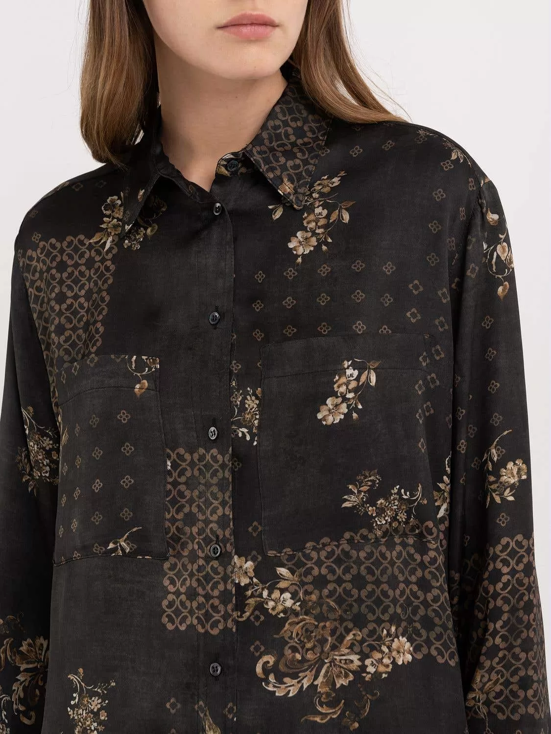 Camisa em cetim viscose com estampa floral integral. Manga comprida apresenta conforto e caimento descontraído. Camisa ten dois bolsos no peito e pelo fecho com botões. COMPOSIÇÃO: 100% VISCOSE.