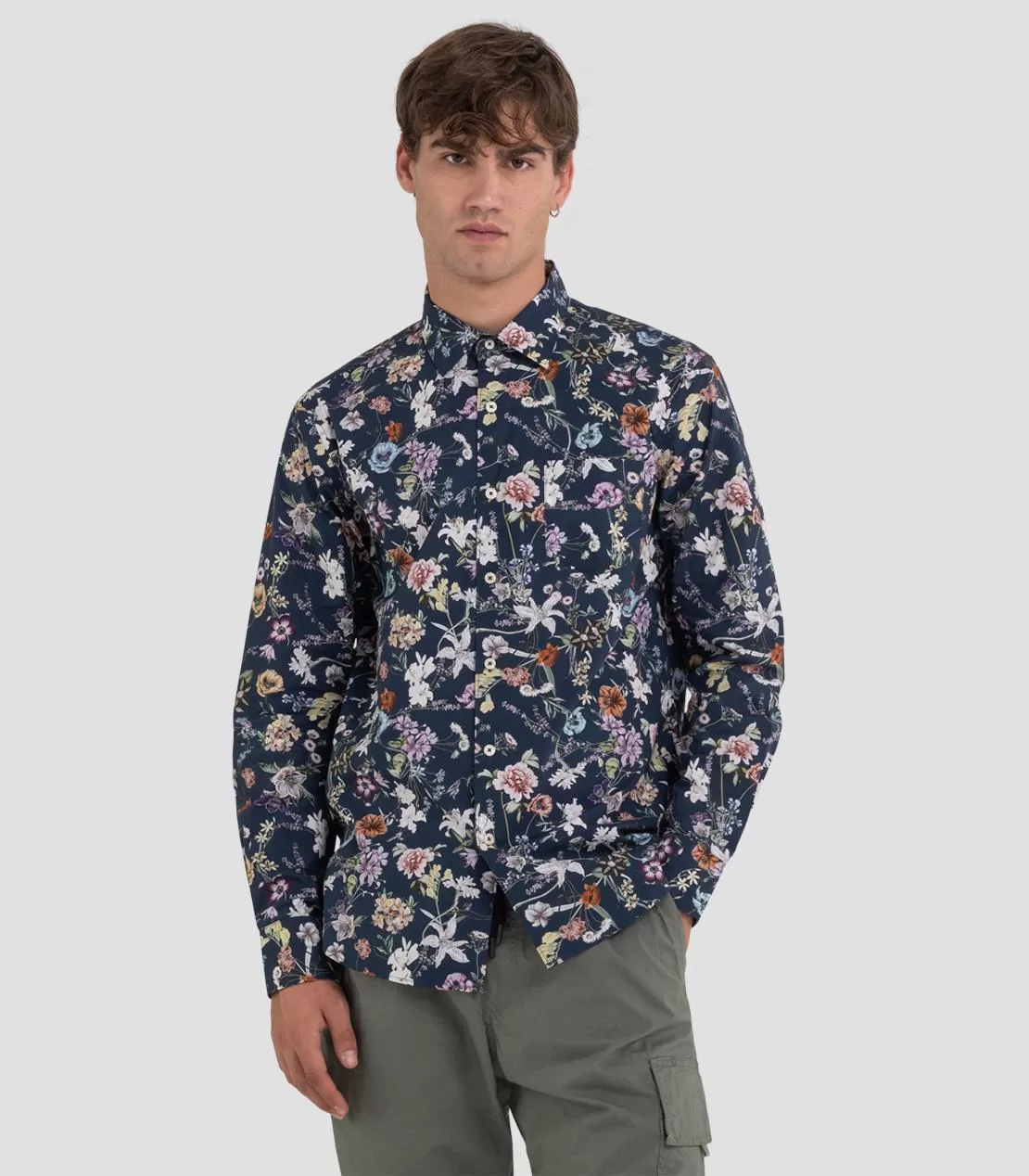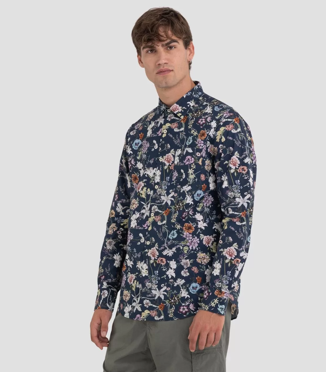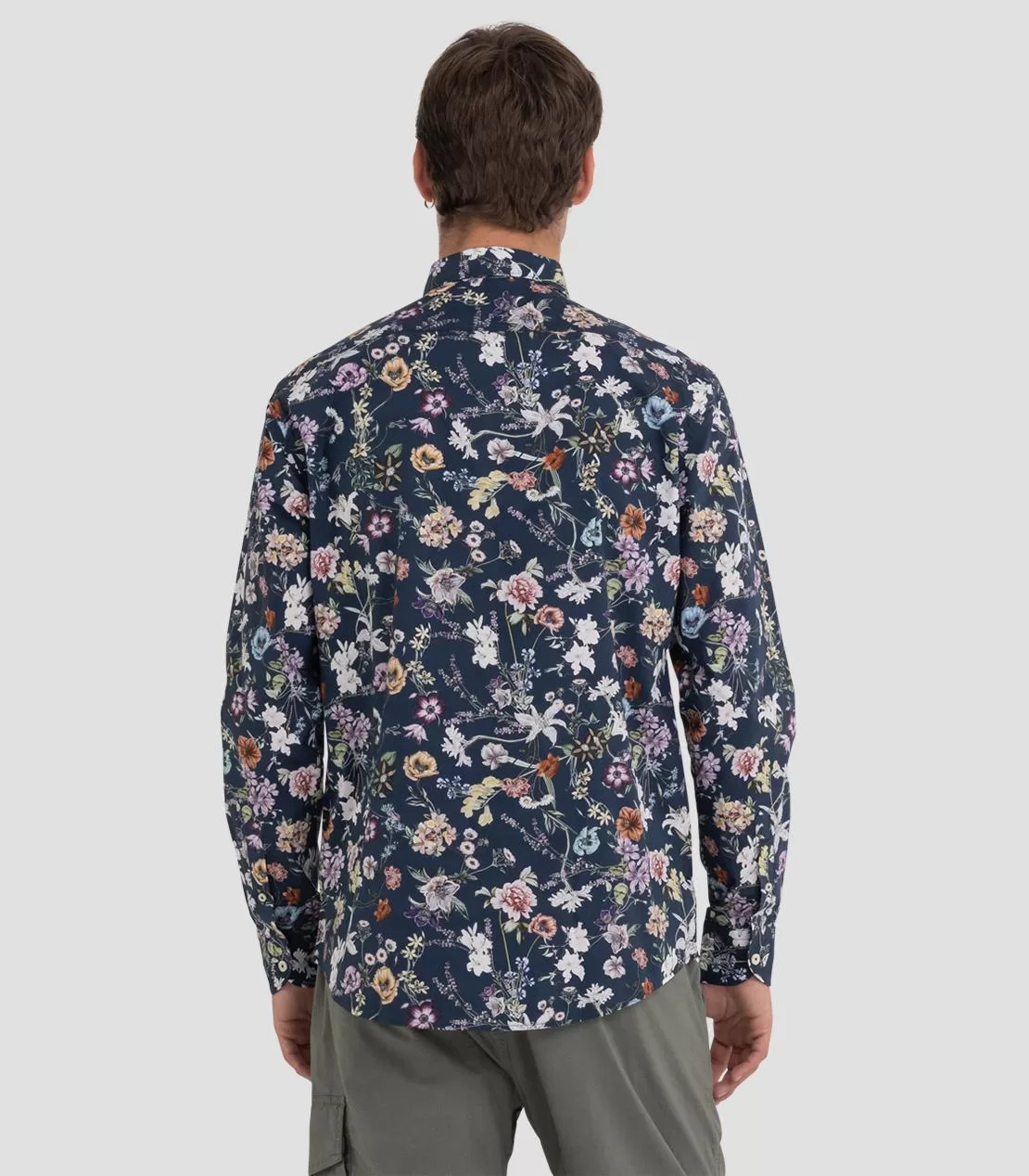 Camisa casual em popeline de algodão leve com estampa floral, mangas longas e modelagem regular, bolso no peito e pela etiqueta personalizada bordada na lateral.