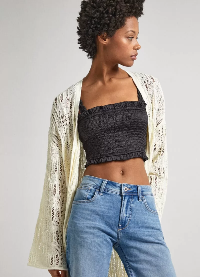 Cardigan comprido em tecido de malha semitransparente. Relaxed fit. Manga comprida. Decote em V. Ombros caídos. Detalhes bordados. Detalhe canelado na gola e na carcela. Fabricada mediante práticas e materiais sustentáveis.