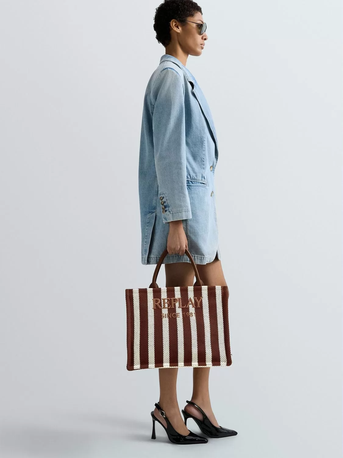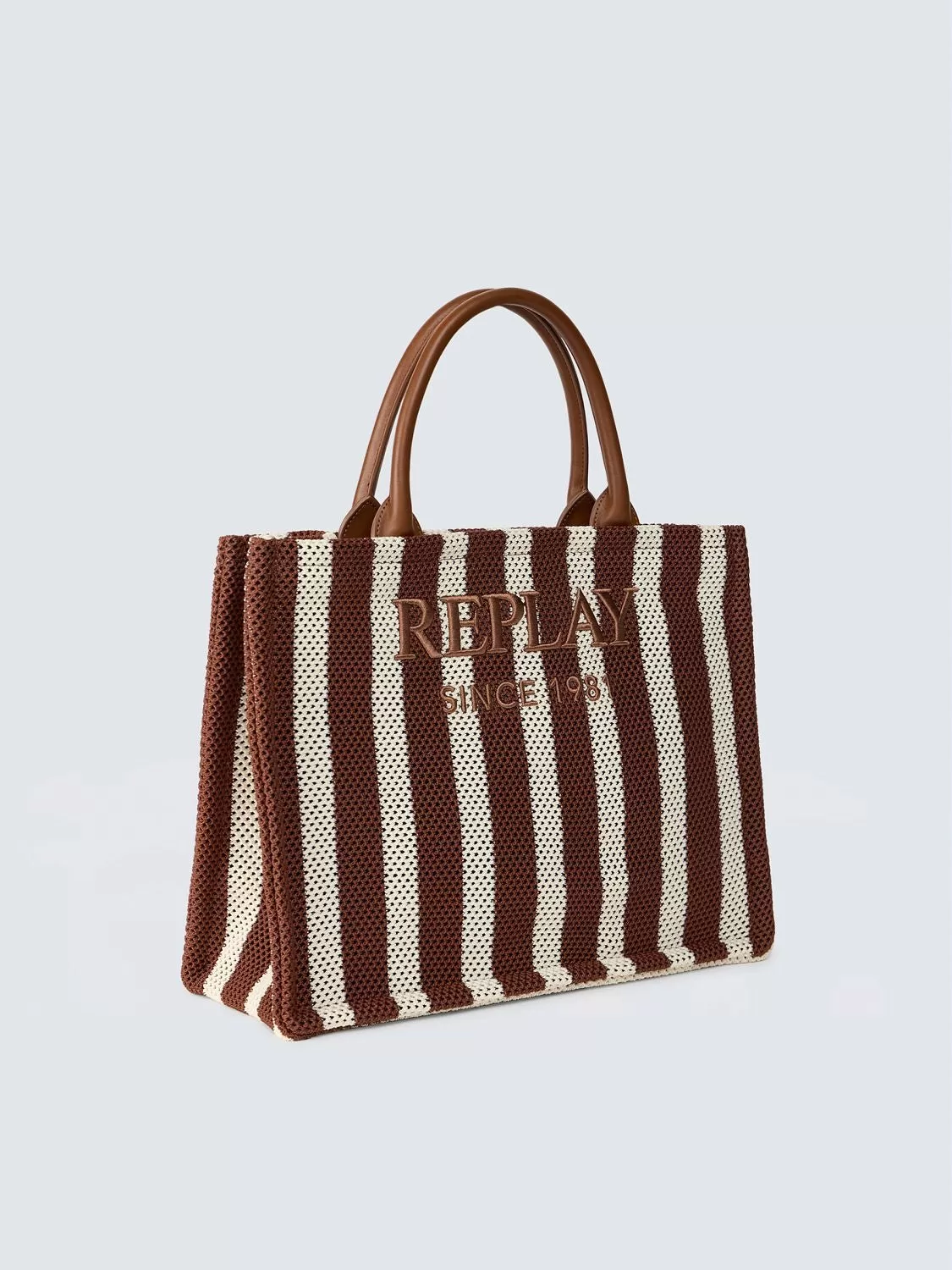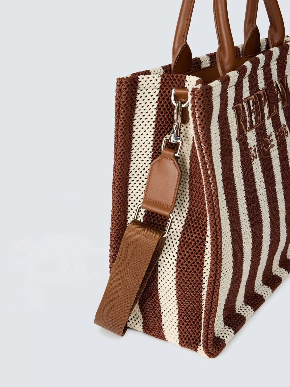 Bolsa tote em tecido perfurado com estampa listrada. Este acessório possui alça dupla em PU e alça ajustável com fivela, enquanto a parte frontal exibe a inconfundível inscrição bordada “Replay”, que representa o DNA da marca. Comprimento 39 cm x Altura 30 cm x Largura 15 cm. – Composição: