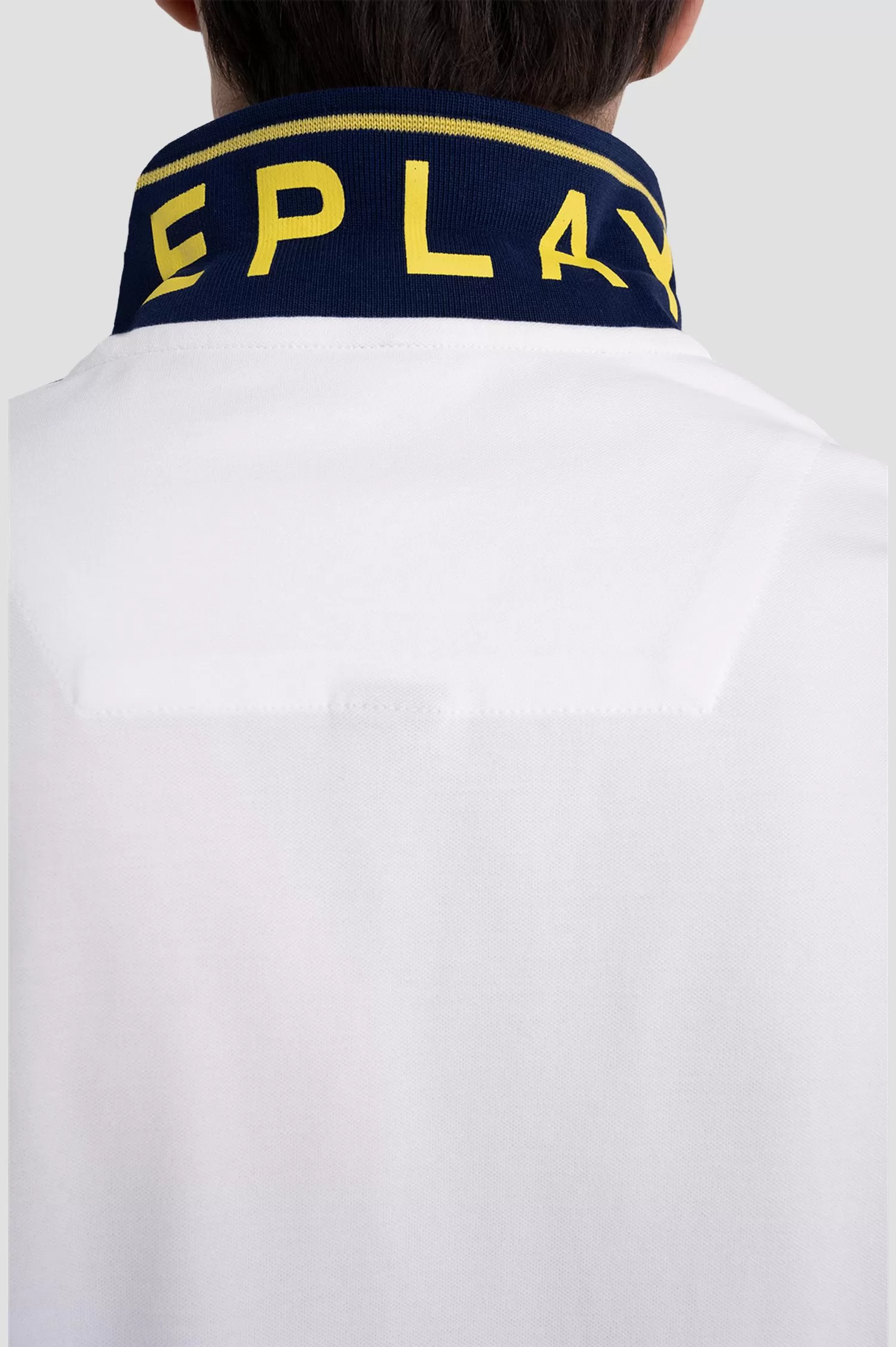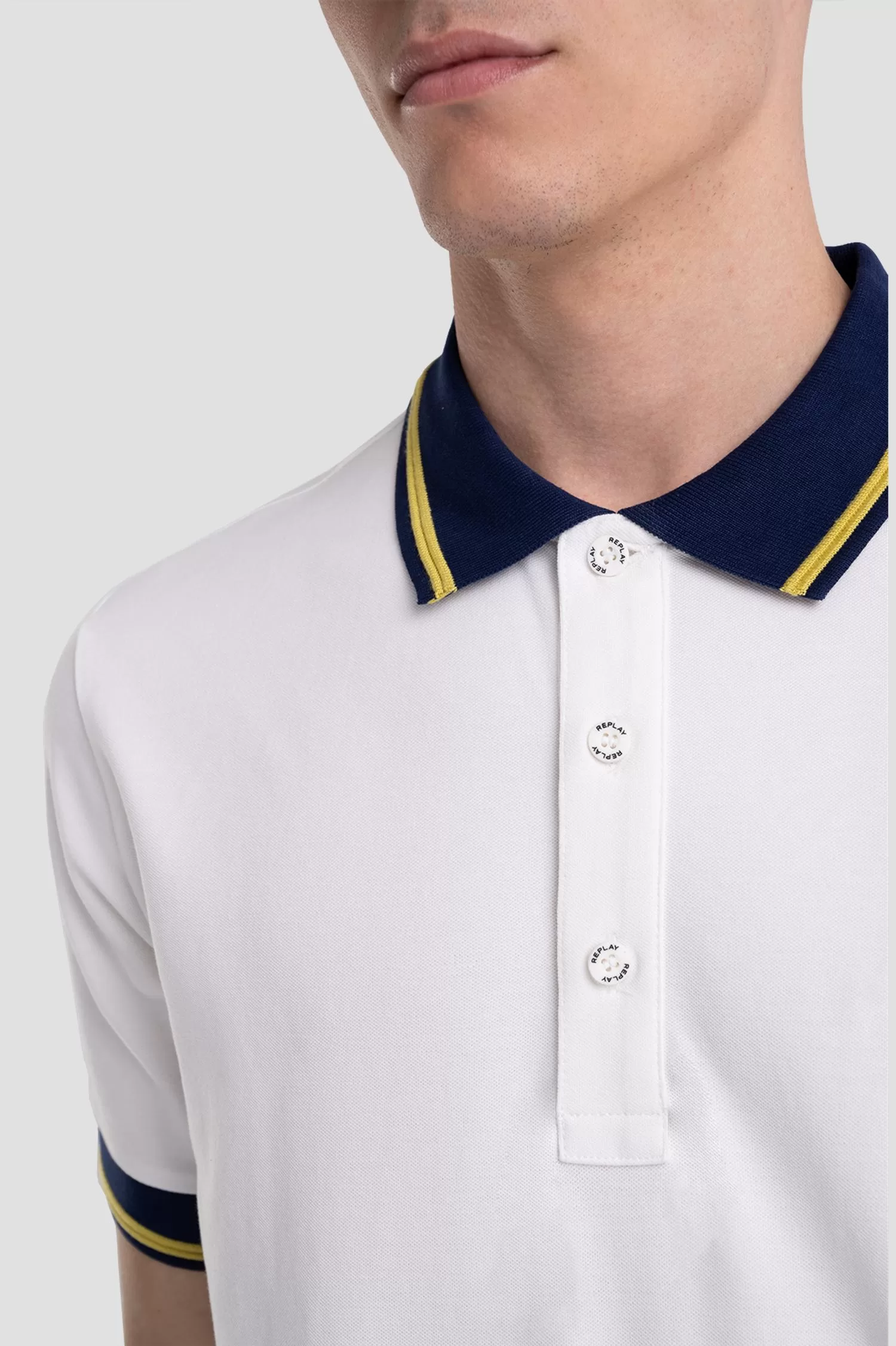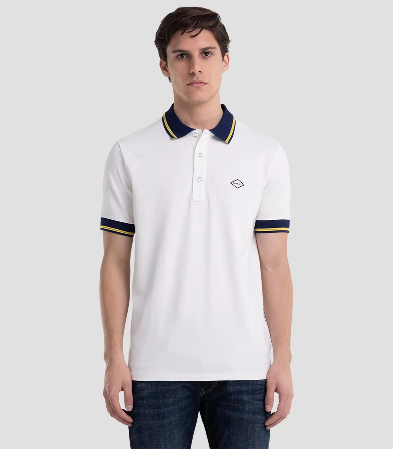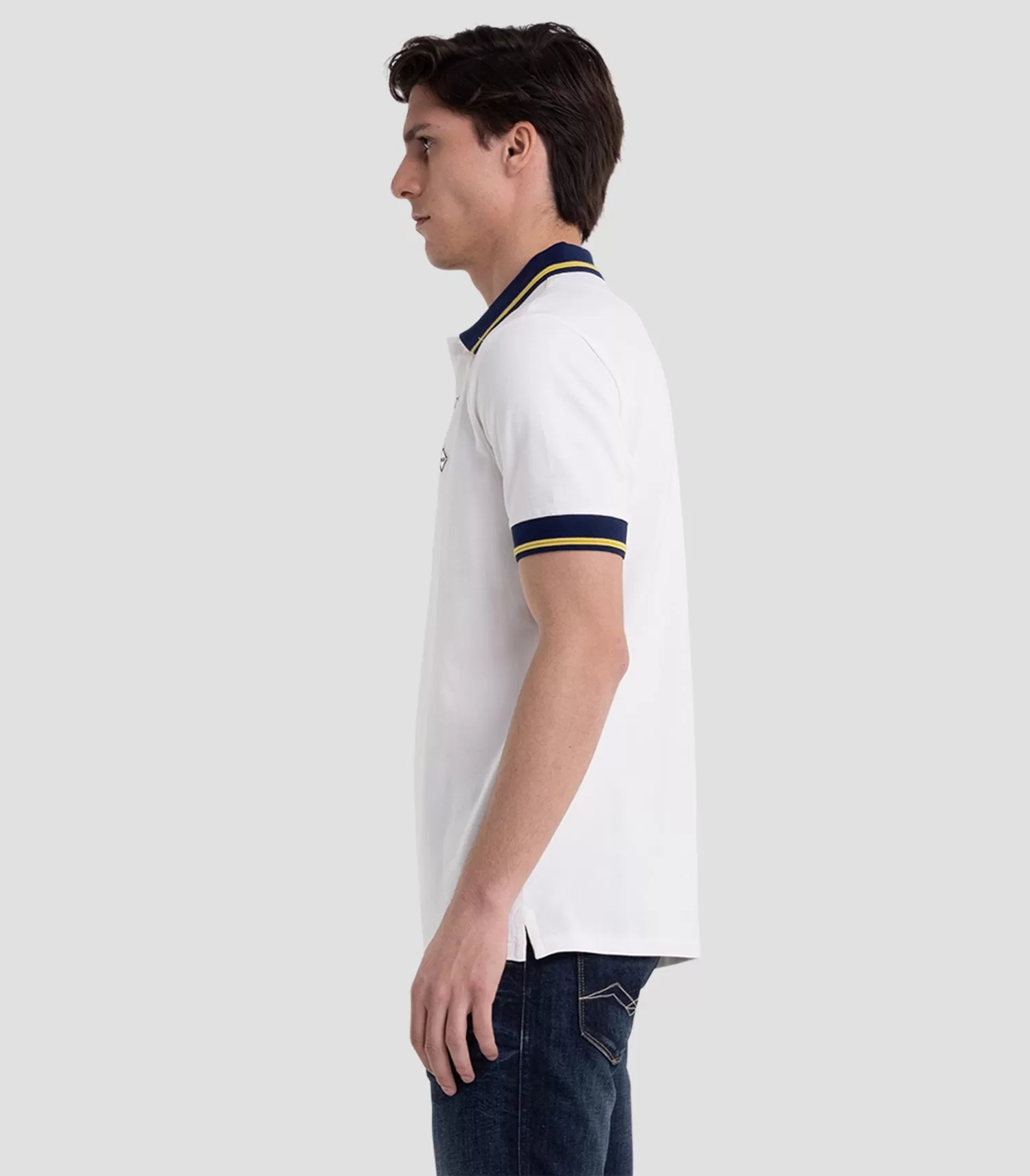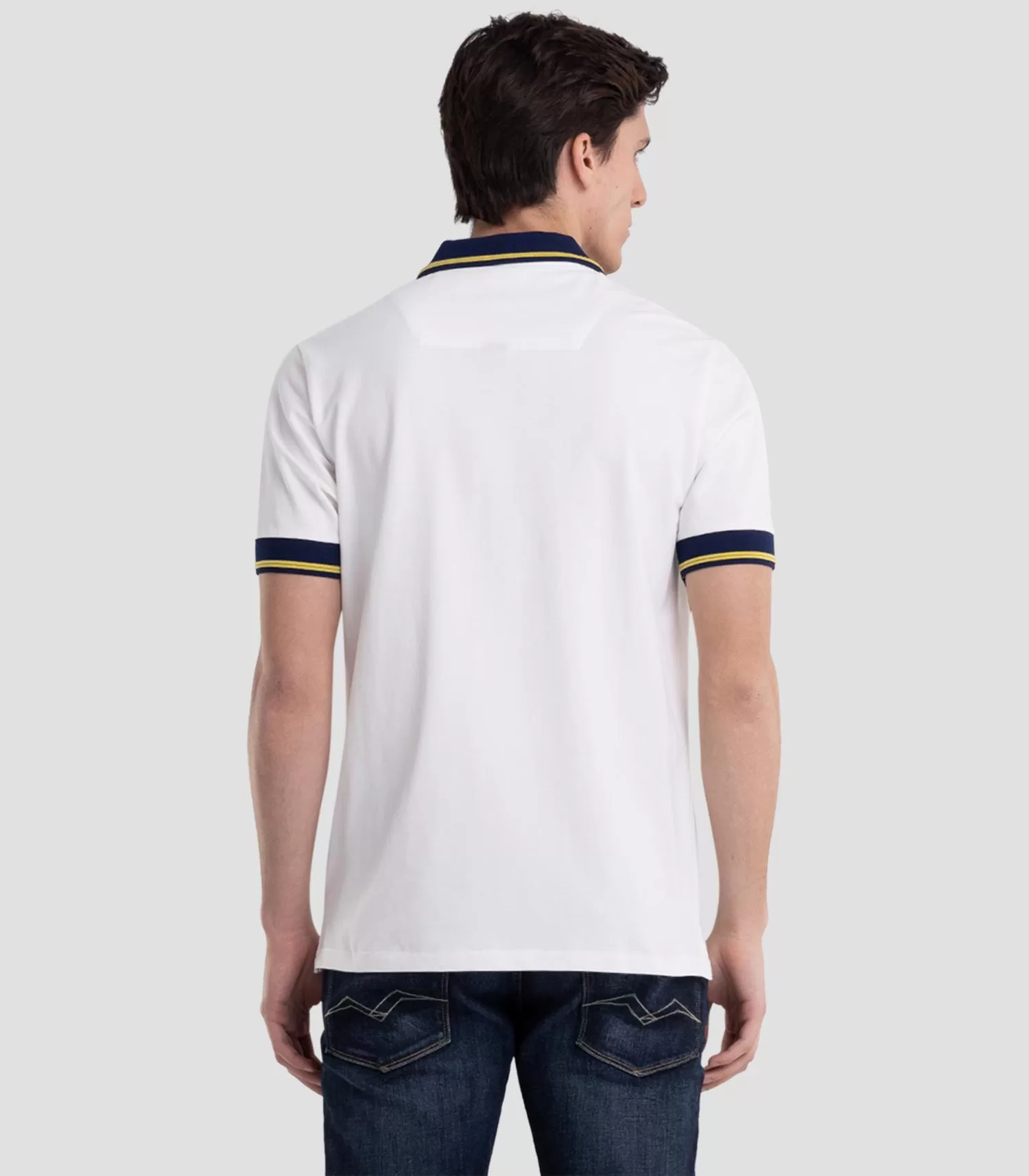Polo de corte regular, manga curta confecionada em piqué de algodão elástico. Polo tem gola com estampado nas costas e pelos punhos em cor contrastante com bordas listradas. Composição: TECIDO EXTERNO: 95% Algodão,5% Elastano