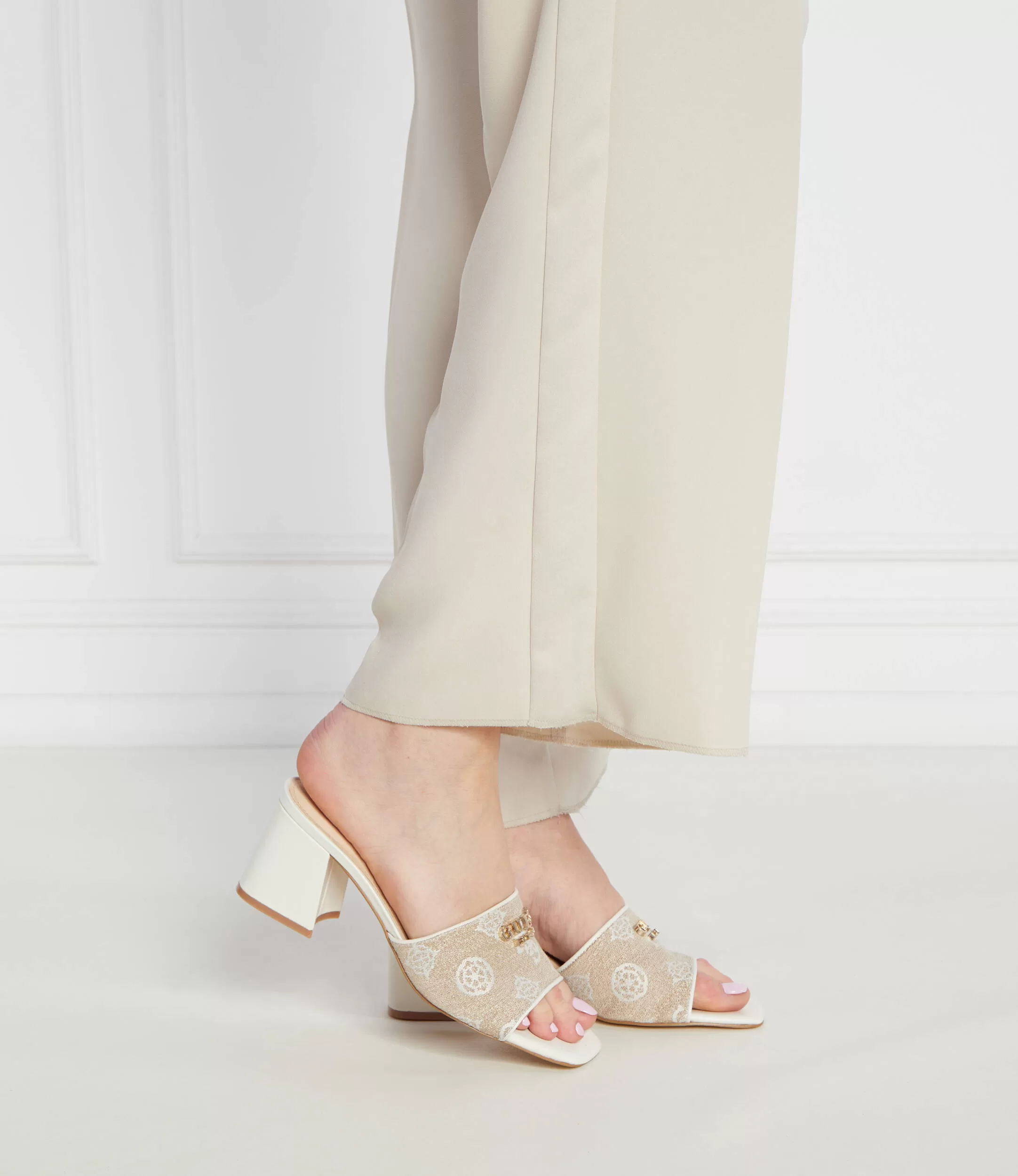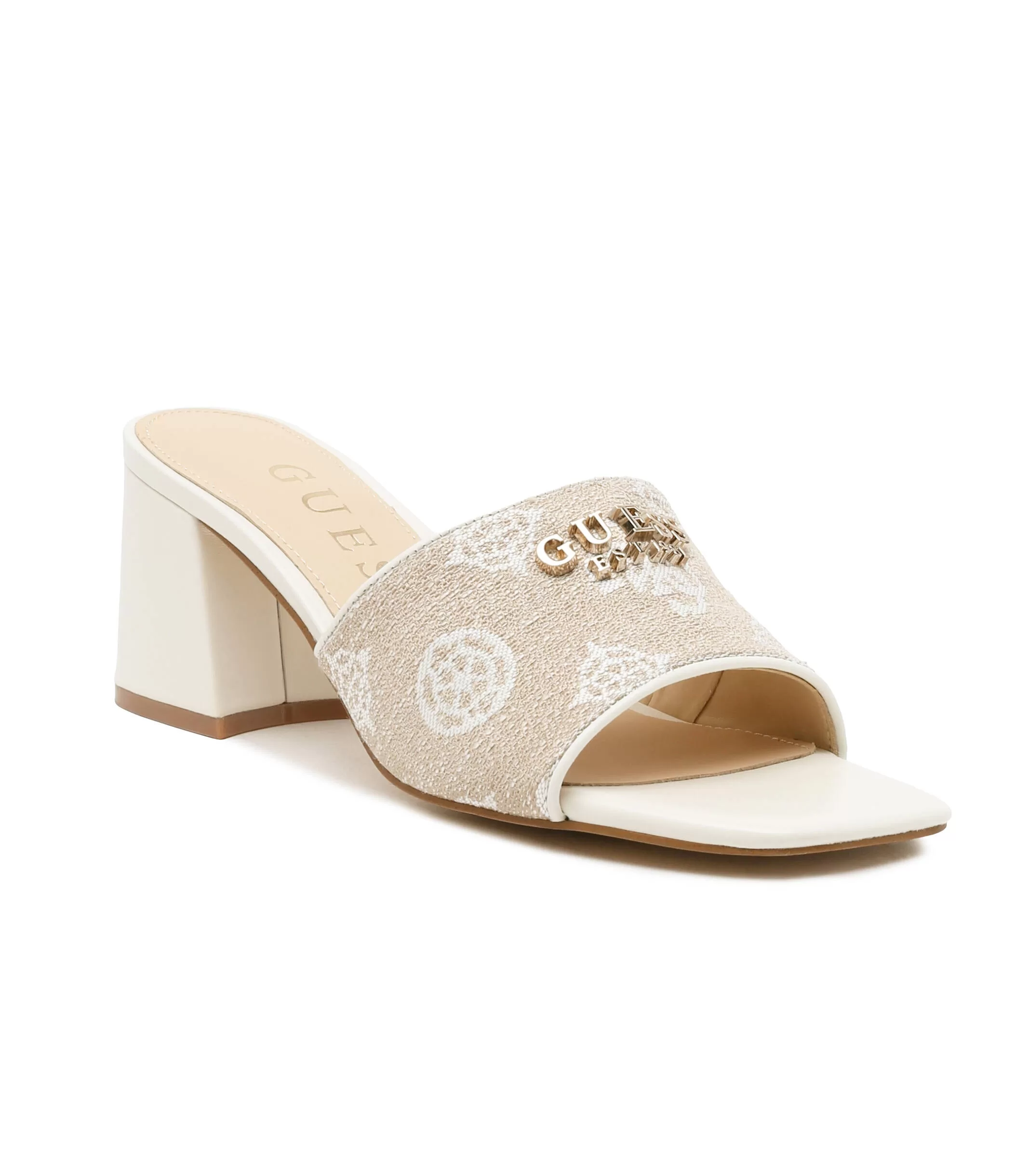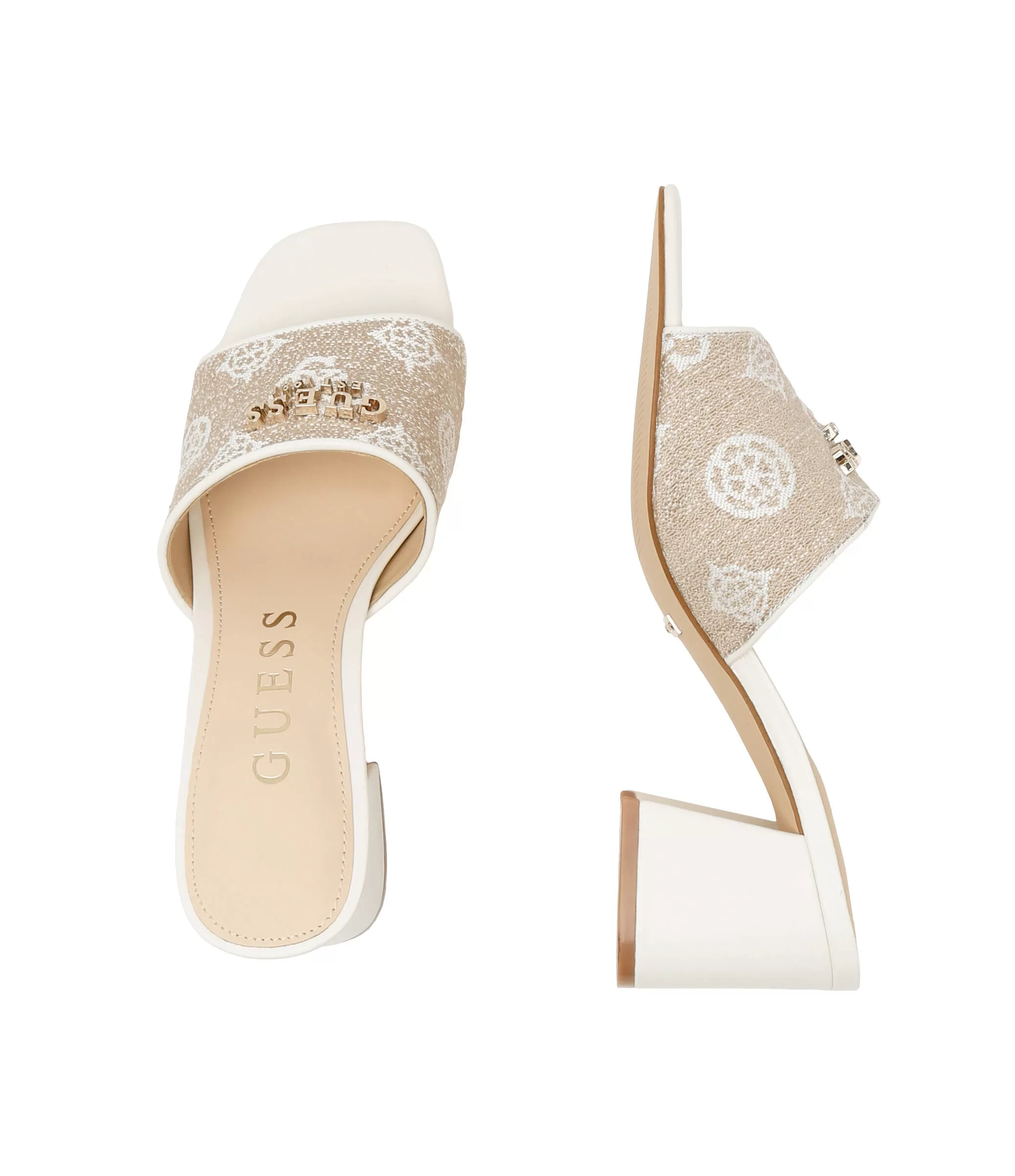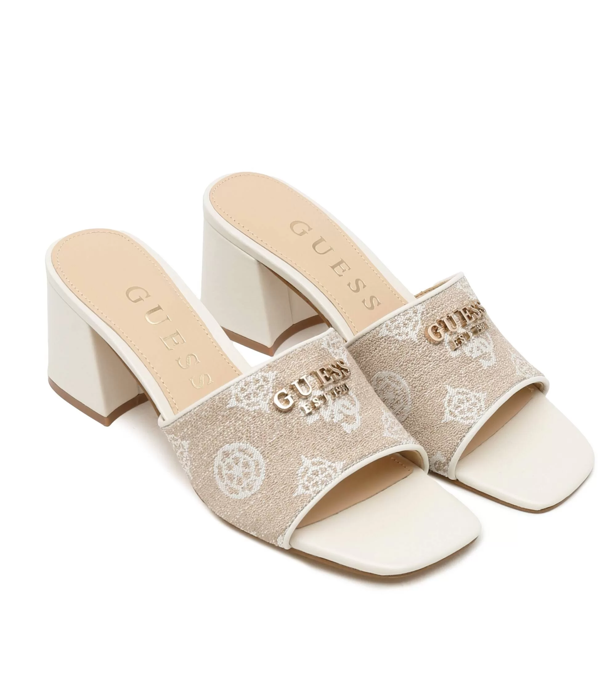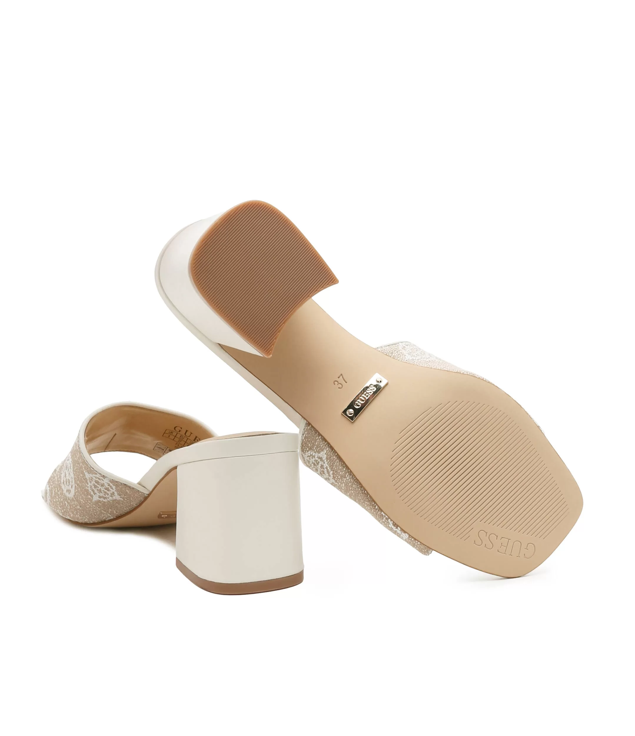 Sandália em tecido sintético. Biqueira quadrada. Altura do tacão 6,5 cm. Estampado 4G e logo peónia em fundo laminado. Texto logo em metal à frente. Composição da gáspea: 95% Poliéster, 5% Pele genuína. Palmilha de pele. Forro interior de tecido. Sola de borracha amortecedora.