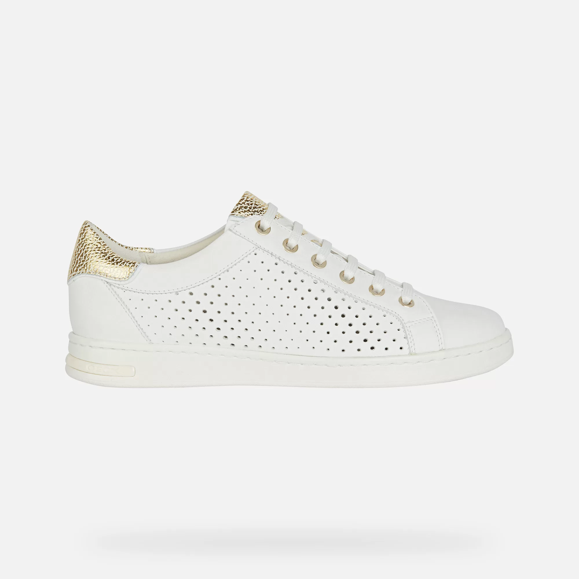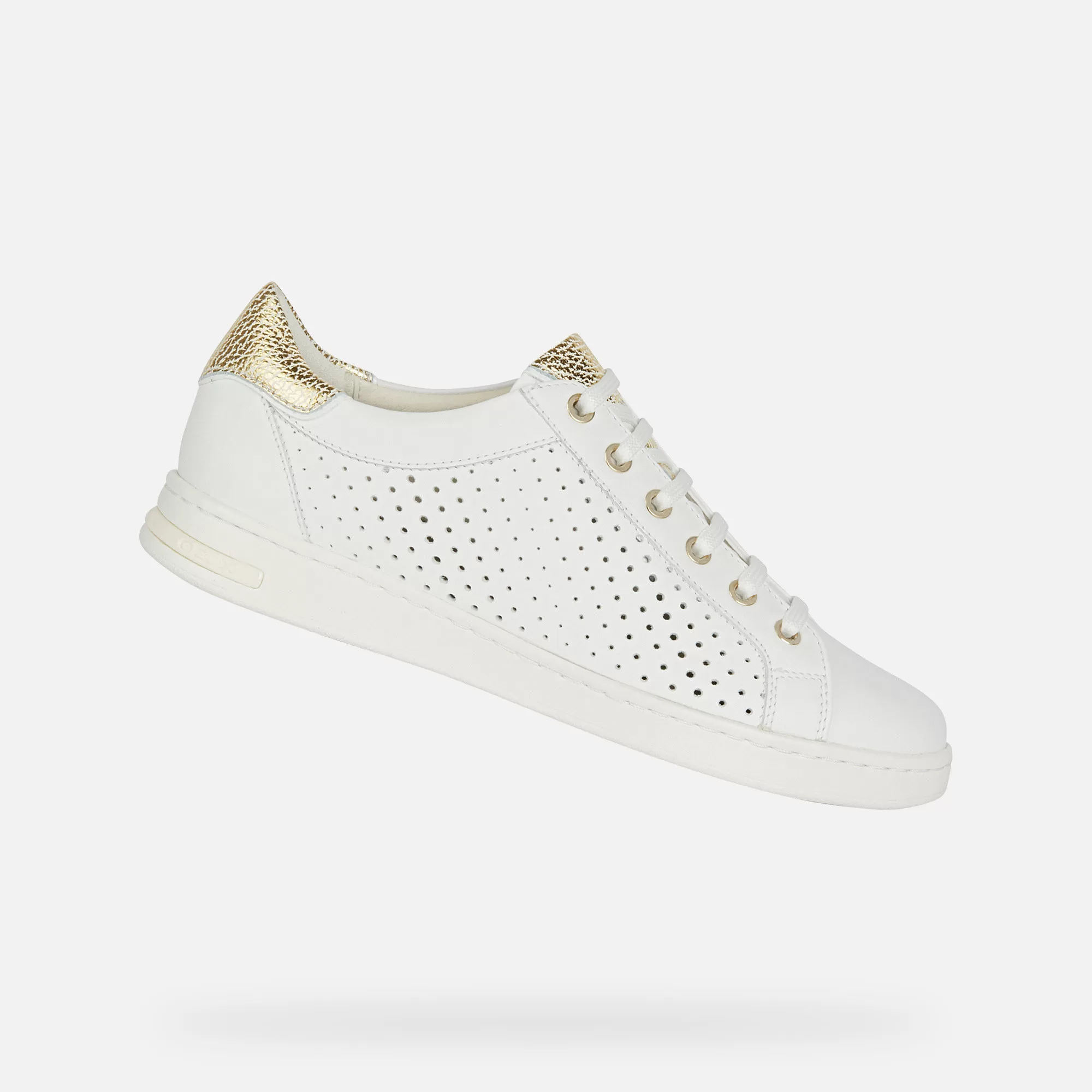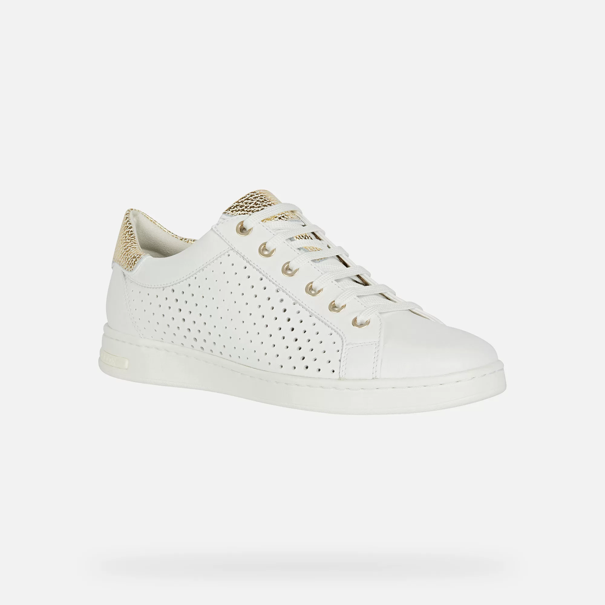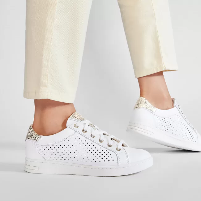 Sneaker low-cut mulher, inspirada no ténis, para um look discreto e com classe. Perfeita para realçar os looks casuais, Jaysen é uma sneaker de napa branca confortável e respirável com detalhes irresistíveis de pele metalizada dourada e uma moderna aplicação perfurada no lado exterior da gáspea.