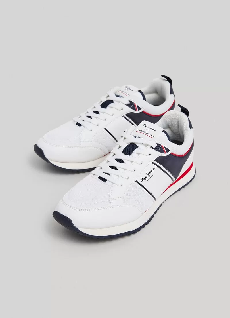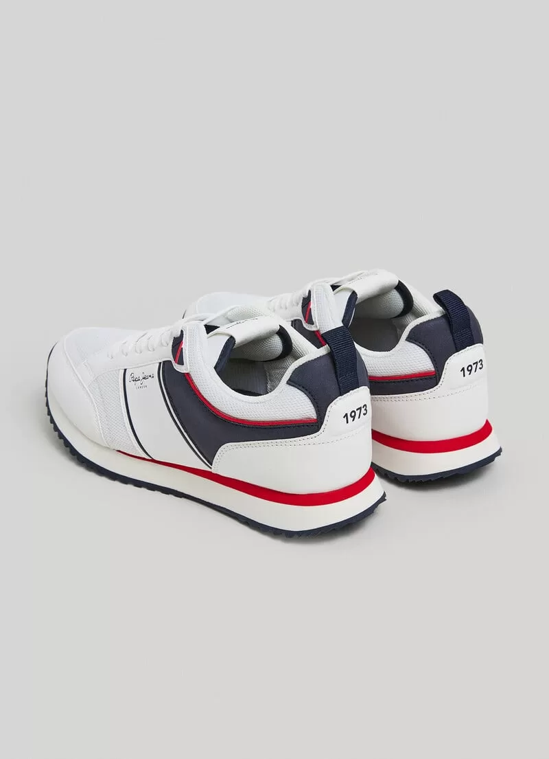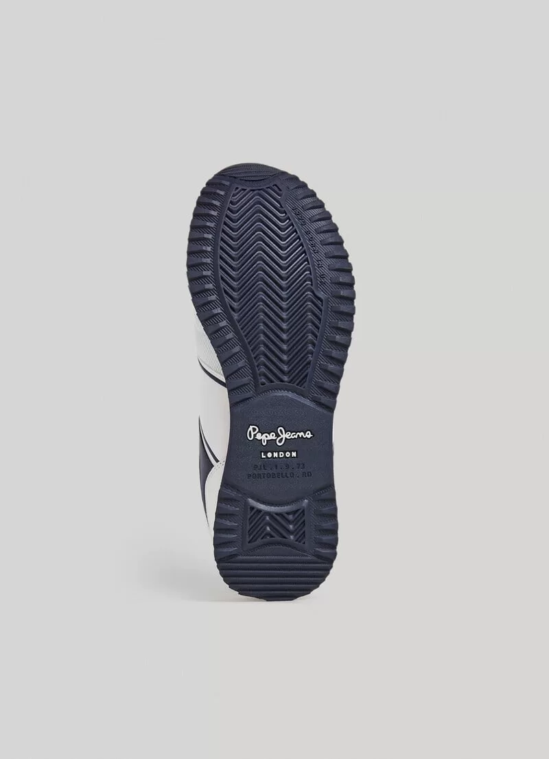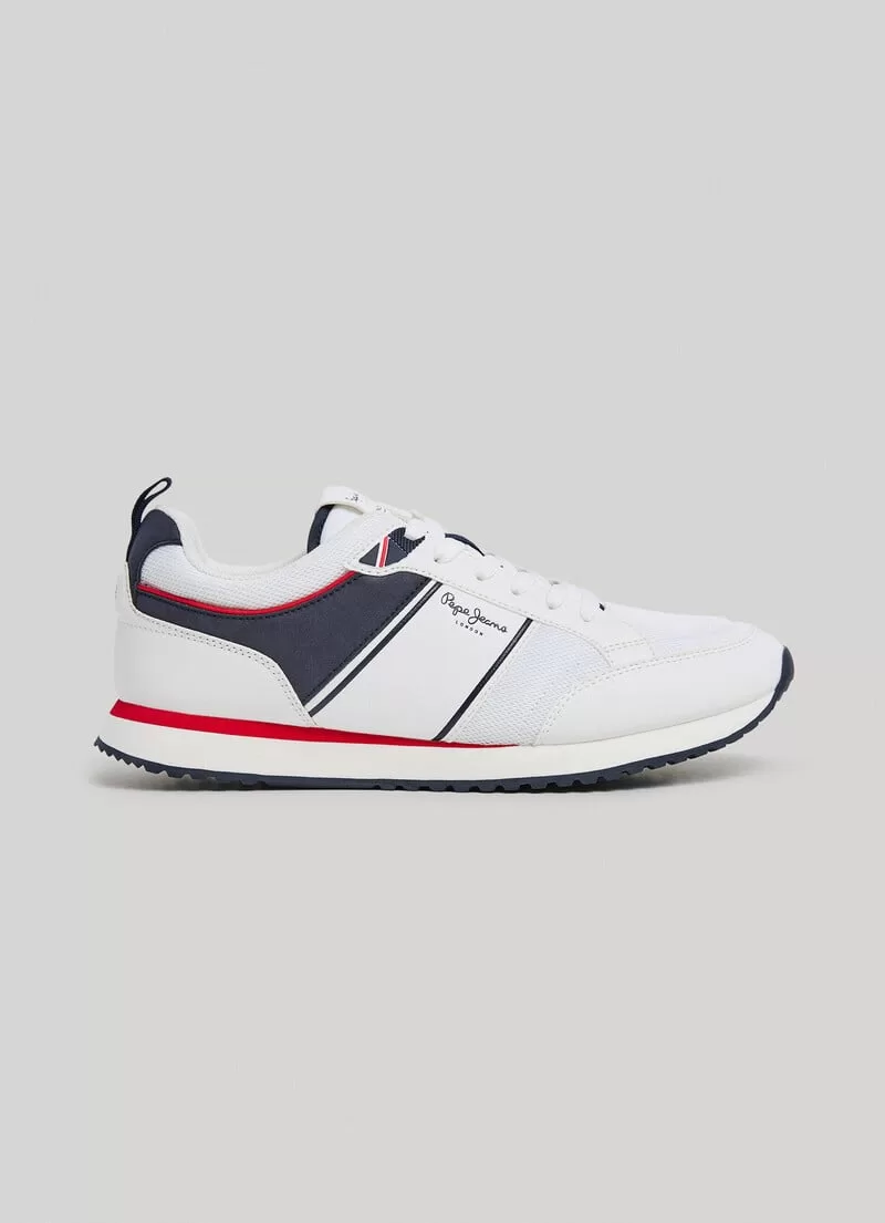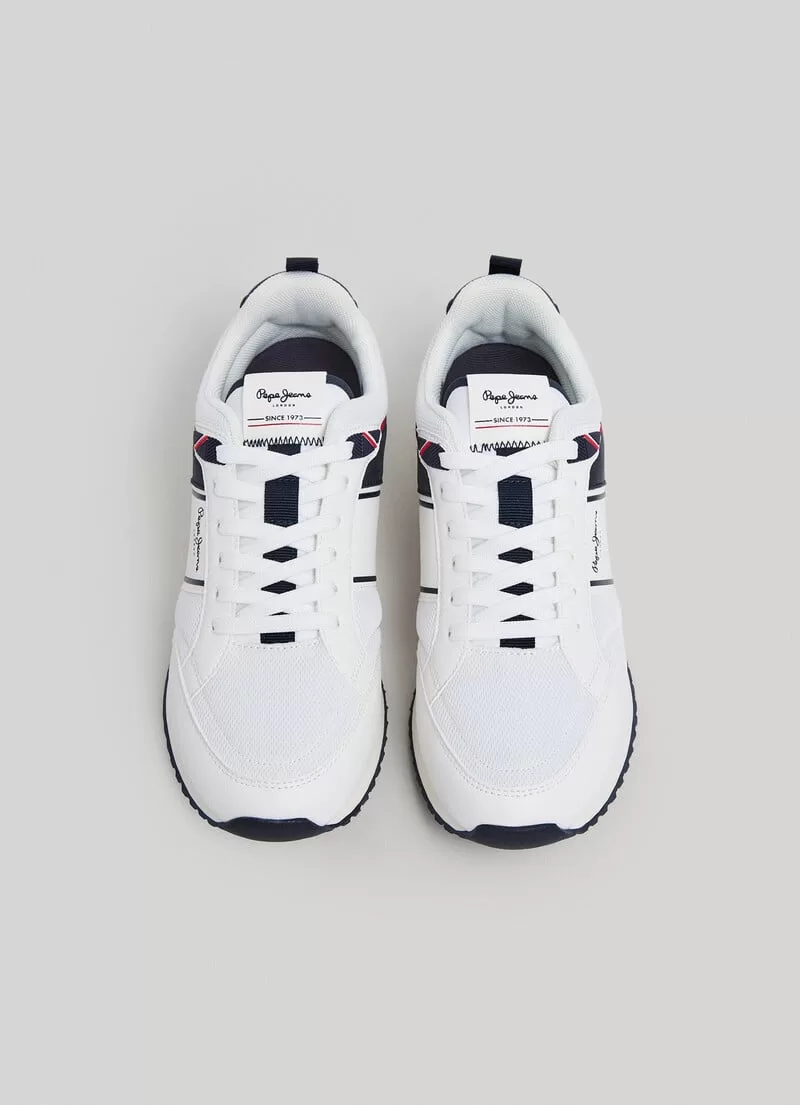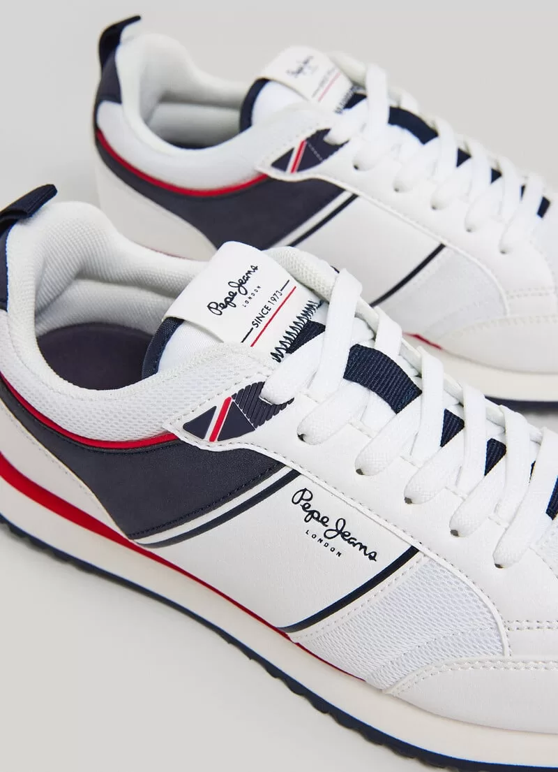Sapatilhas running. Combinação de tecidos. Cores contrastantes. Com atacadores. Tecido de malha no peito do pé e nas laterais. Logo PEPEJEANS gravado nas laterais. Puxador traseiro. Entressola extraleve em borracha EVA bicolor. Sola de borracha. COMPOSIÇÃO: 75% Poliuretano, 25% Poliéster.