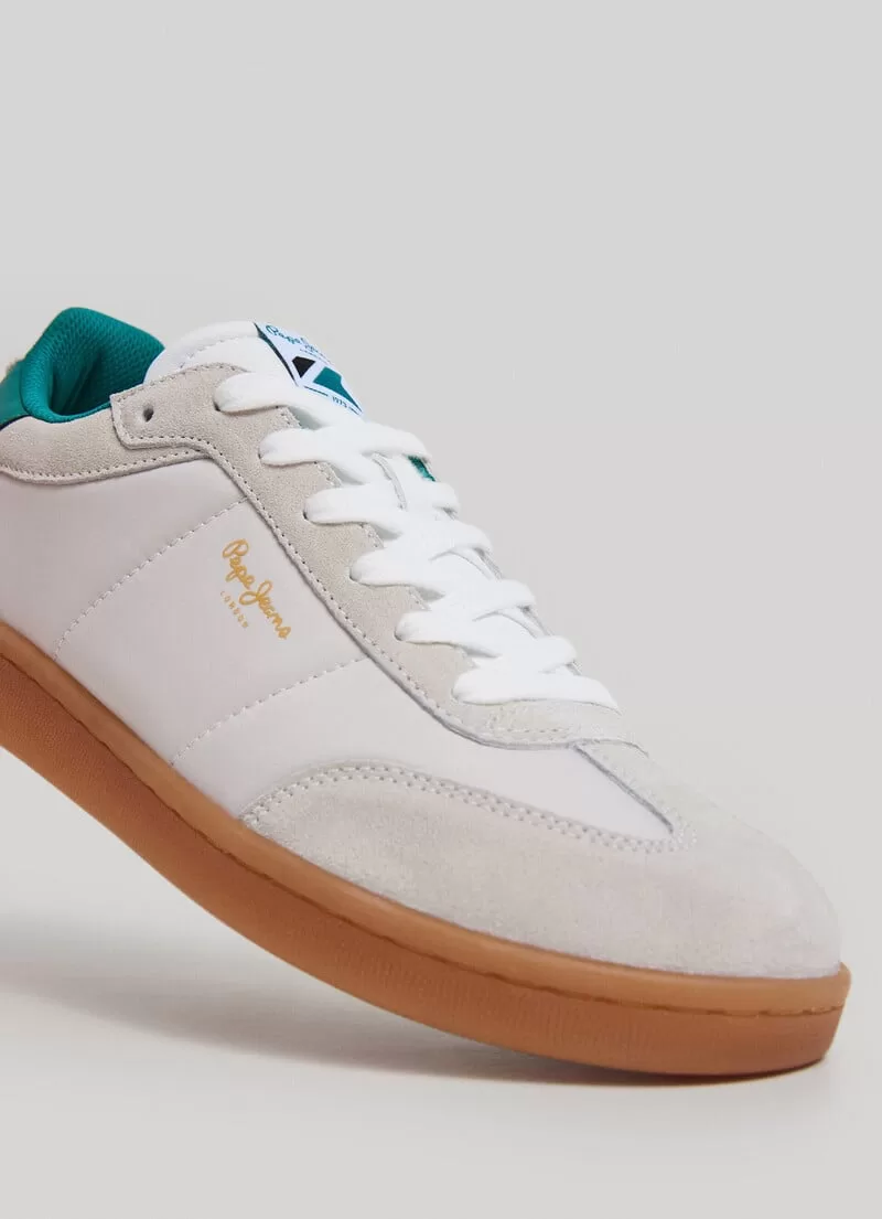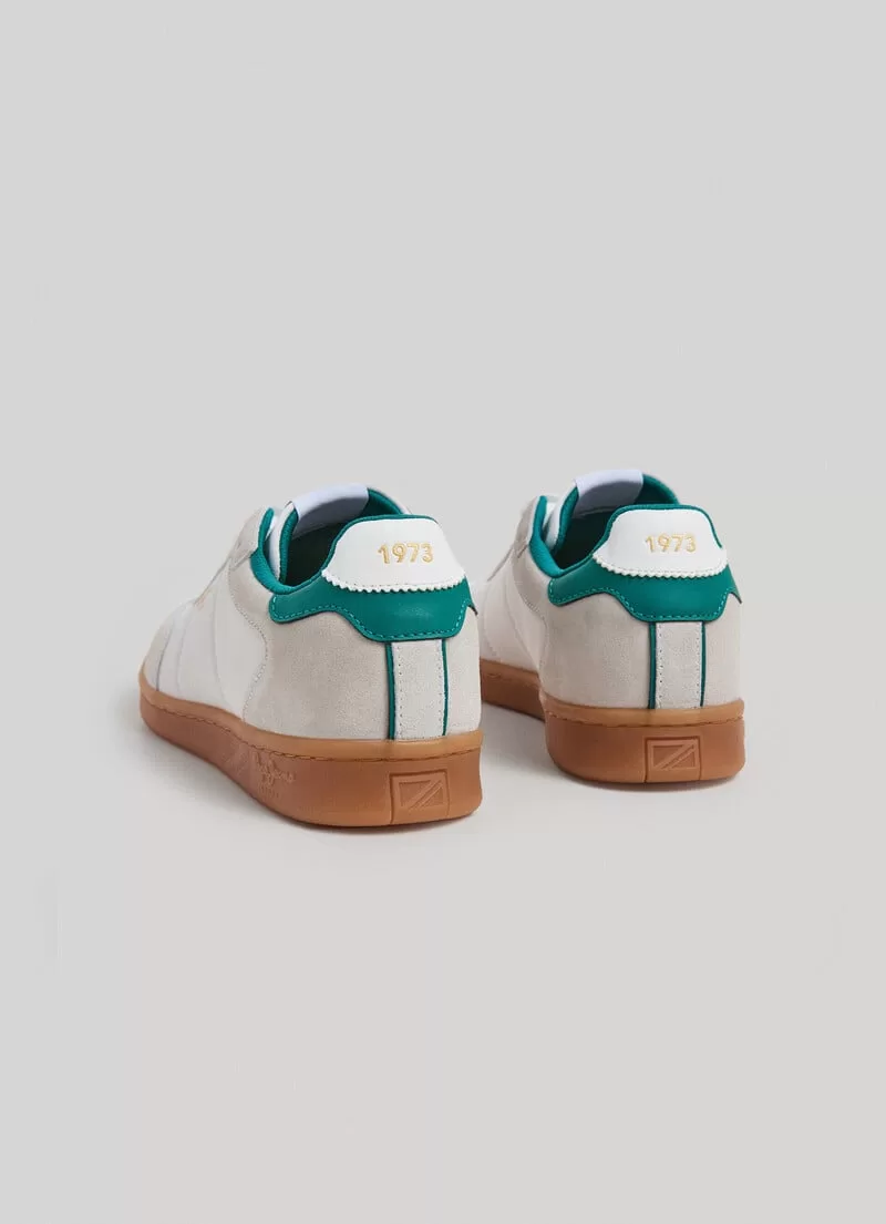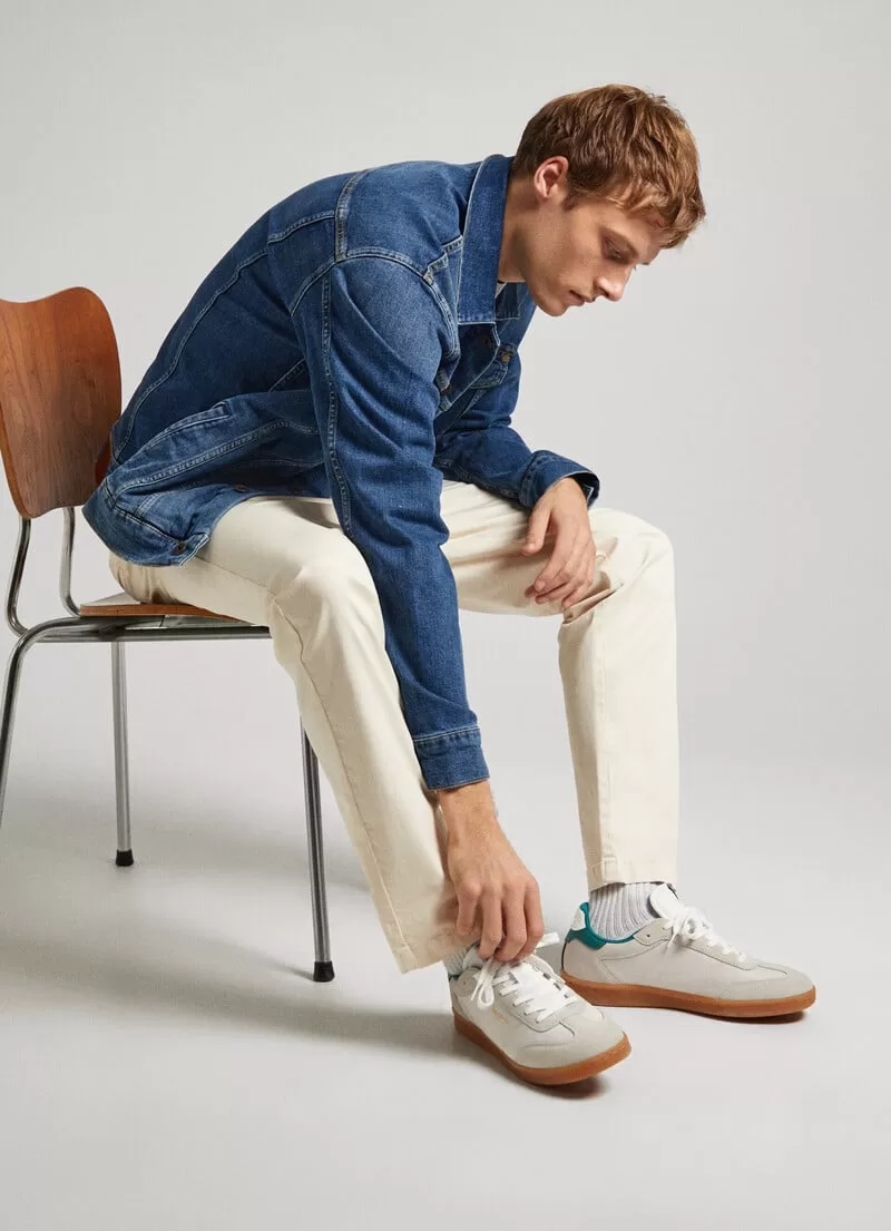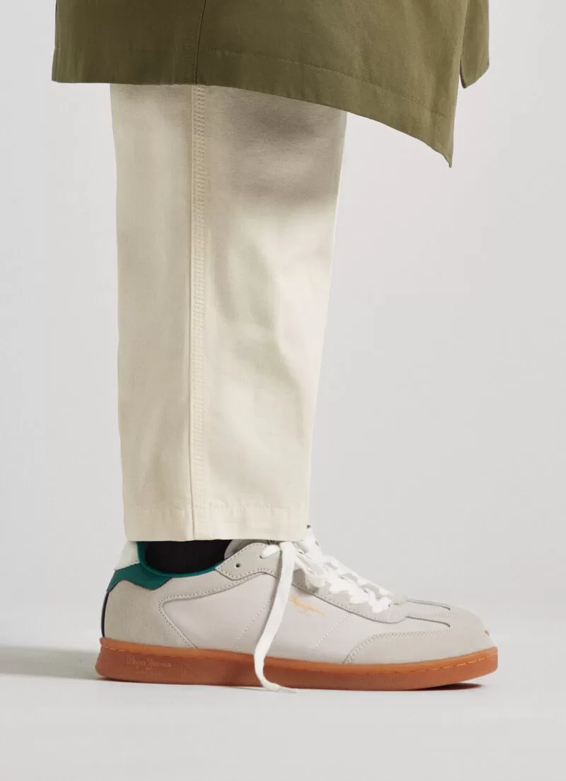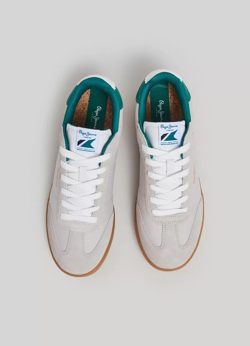 Sapatilhas em combinação de tecidos. Cores contrastantes. Com atacadores. Detalhes de camurça na biqueira, atacadores e calcanhar. Logo PEPEJEANS selado termicamente nas laterais. Acolchoadas na zona do tornozelo. Palmilha de cortiça. Calcanhar em contraste com Logo 1973. Etiqueta com PEPEJEANS Logo na língua. Sola cupsole de borracha. COMPOSIÇÃO: 60% Camurça, 30% Poliester, 10% Poliuretano.