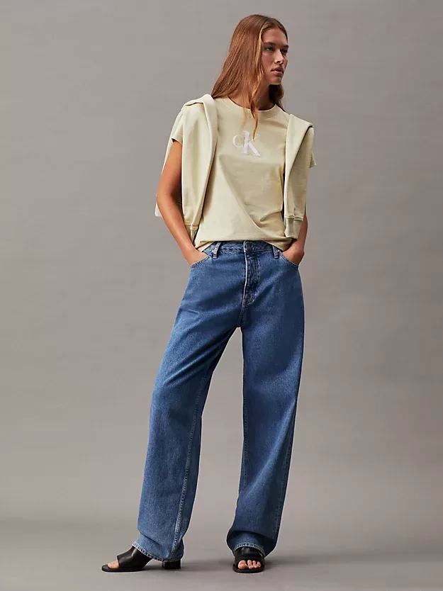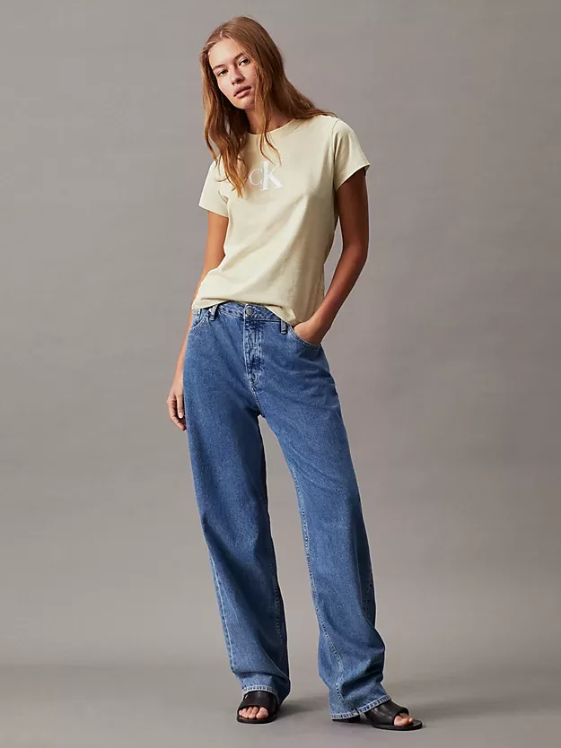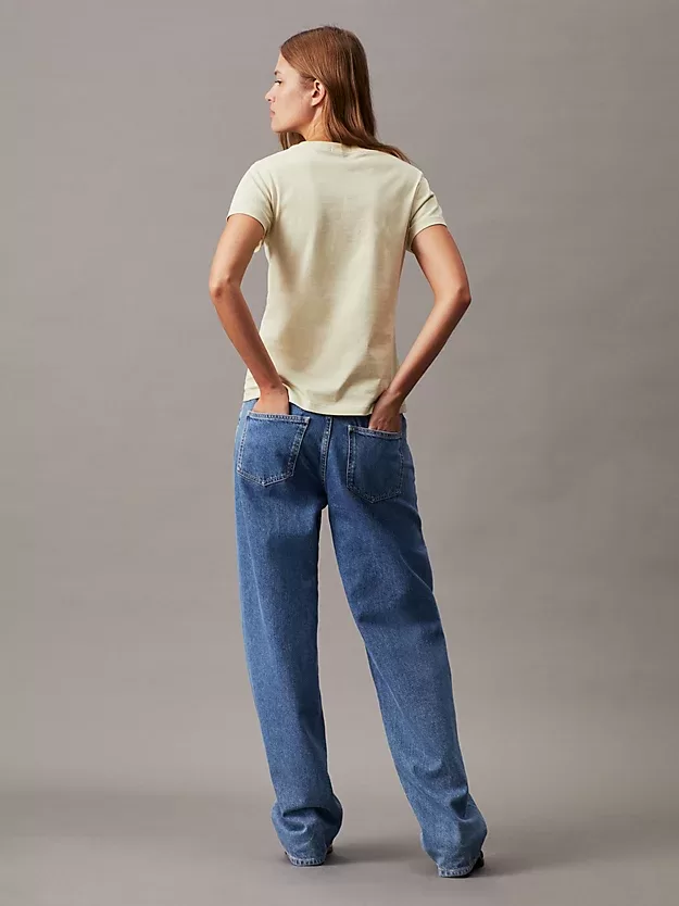 T-Shirt de algodão. Corte justo. Decote redondo. Manga curta. Aplique de cetim Calvin Klein no peito. Composição: 100% algodão regenerativo.