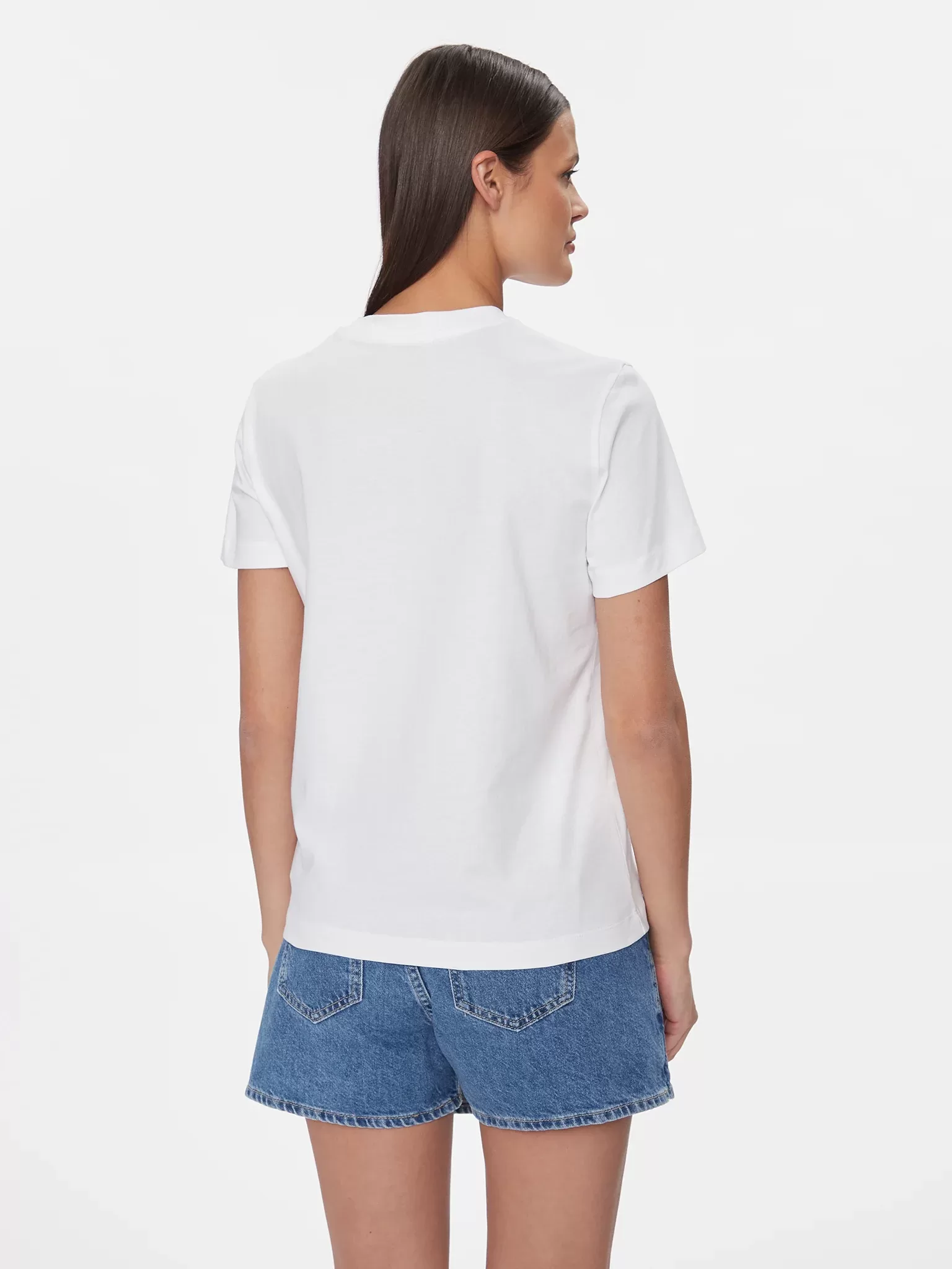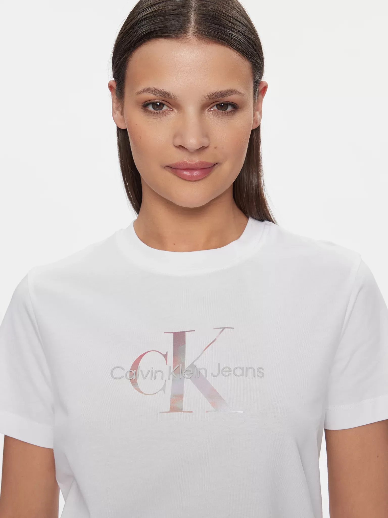 T-Shirt de algodão. Tamanho normal. Decote redondo. Manga curta. Logotipo iridescente da Calvin Klein no peito. Composição: 100% algodão regenerativo