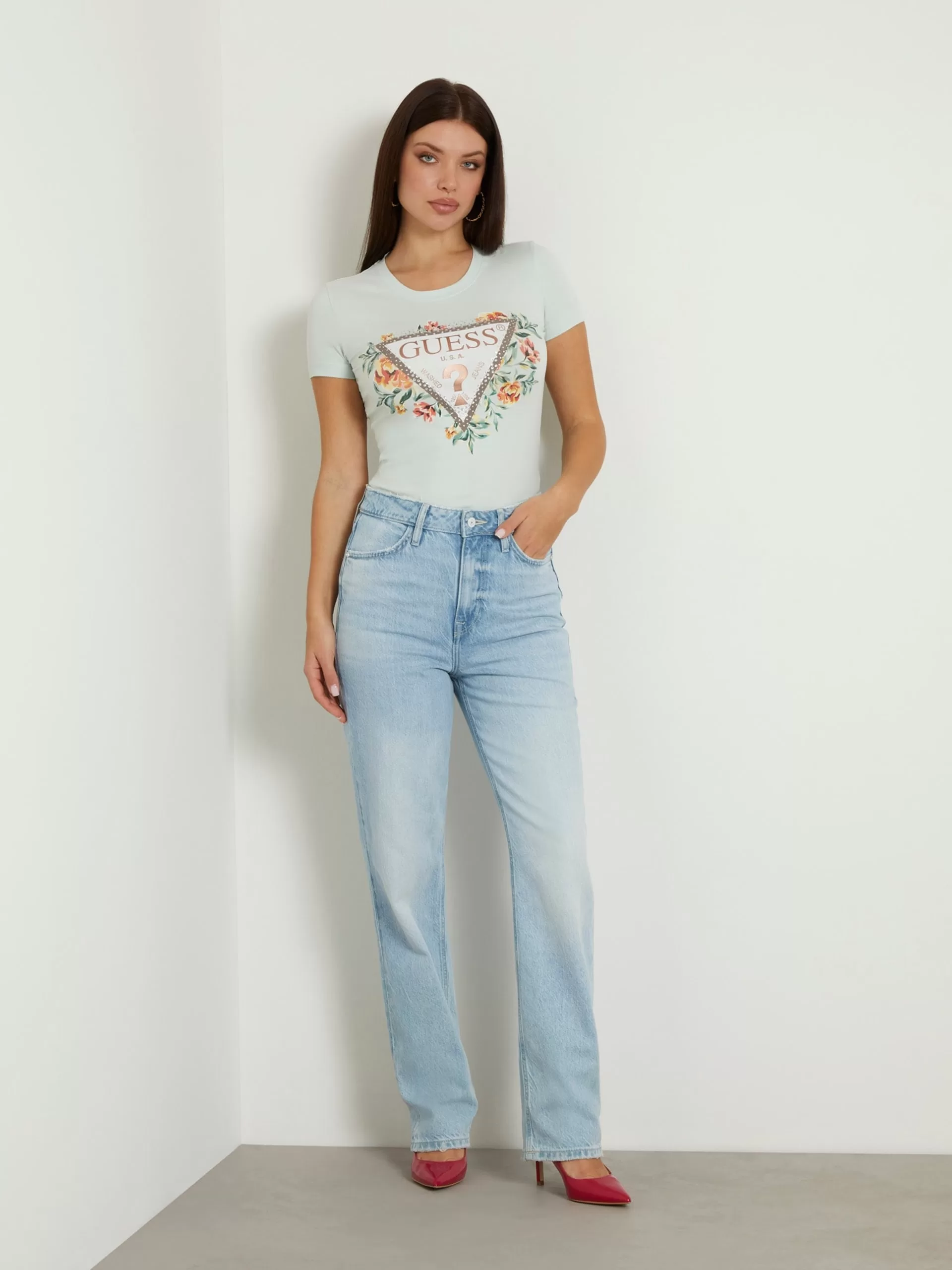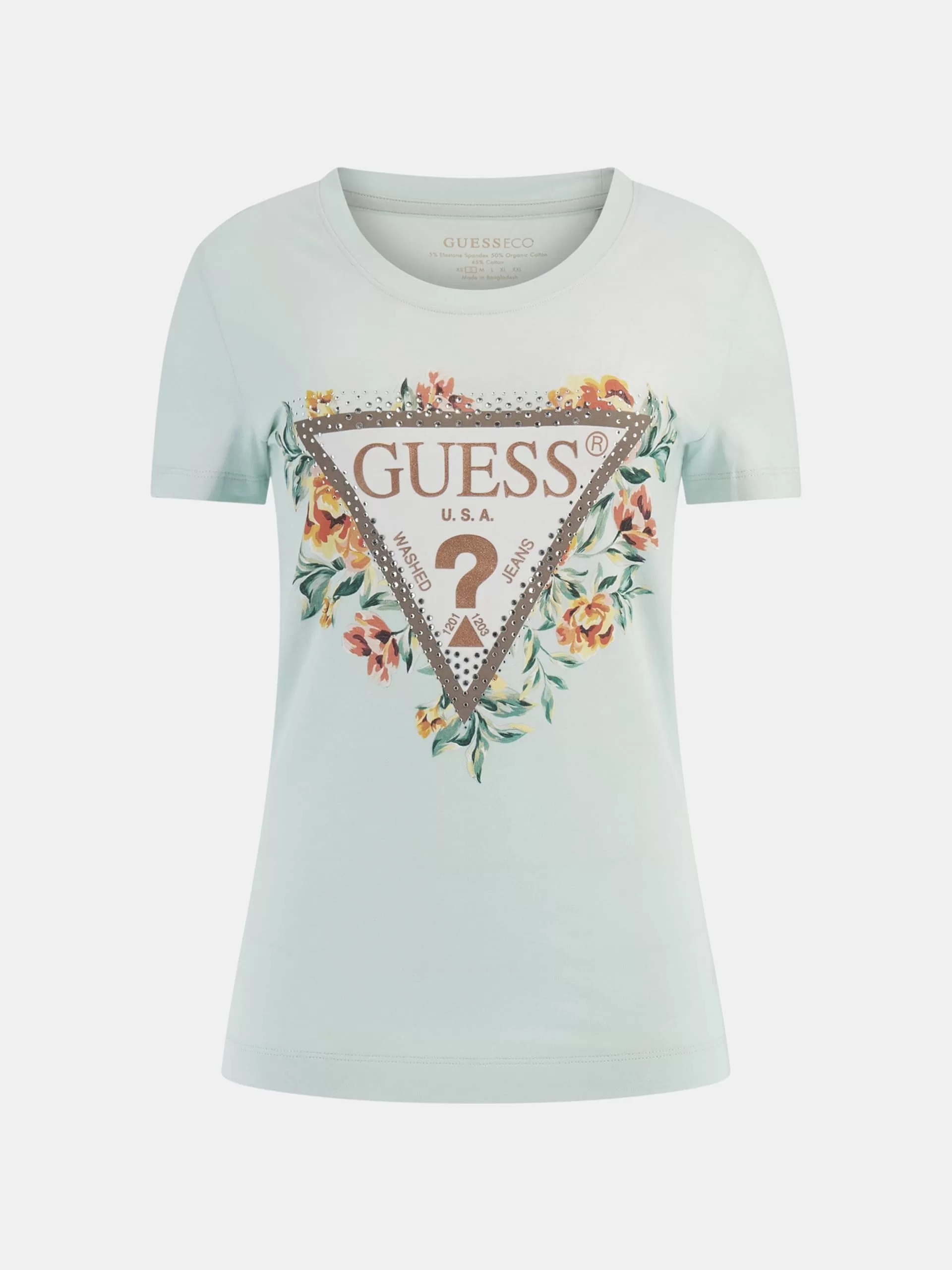 T-shirt em mistura de algodão. Decote redondo. Manga curta. Slim fit. TIPO DE TECIDO: Jersey. DETALHES DO TECIDO: Logótipo de flores. ADORNO: Strass. Composição: REVESTIMENTO (tecido principal): 95% Algodão, 5% Elastano.