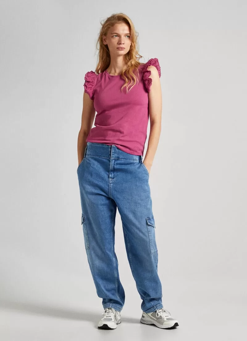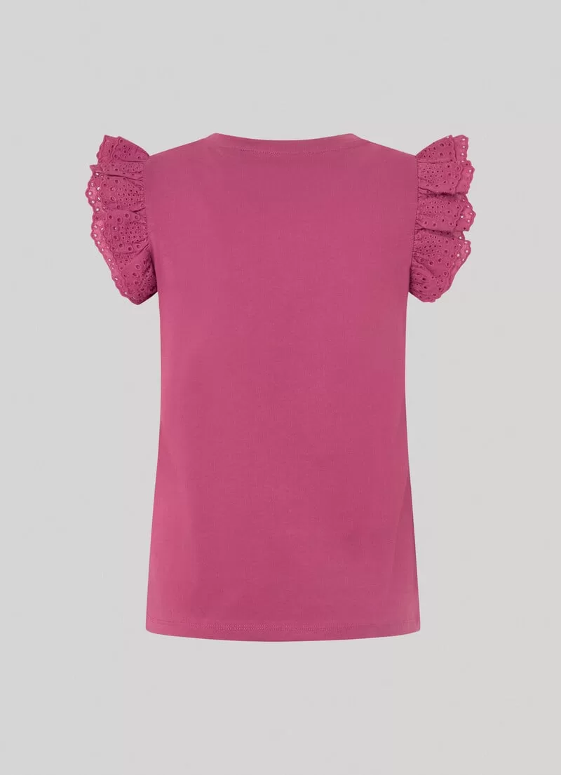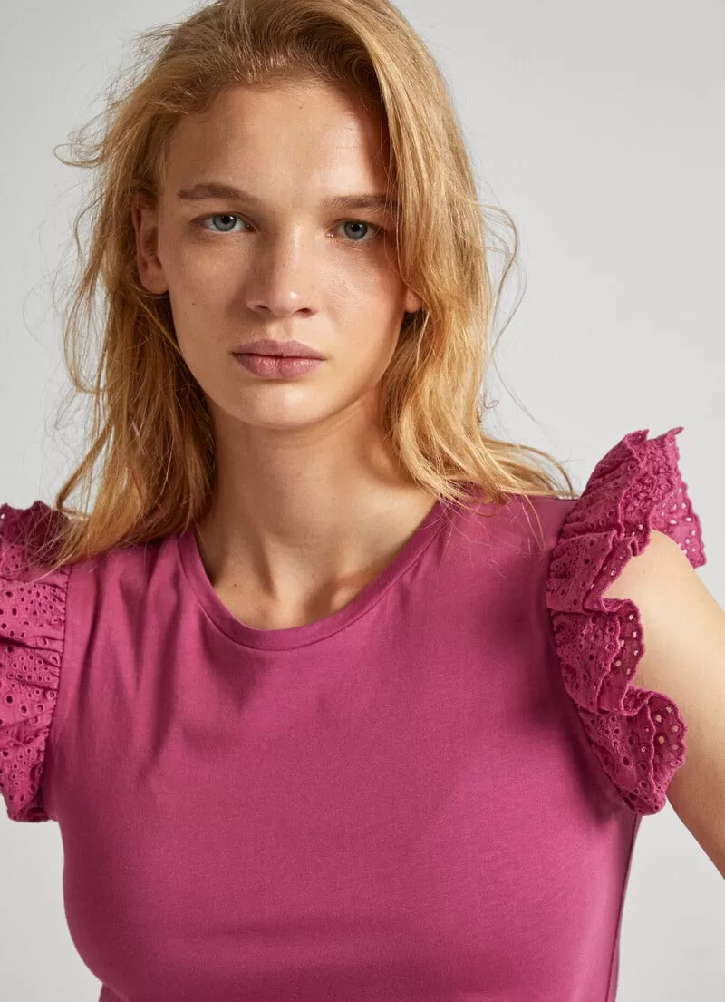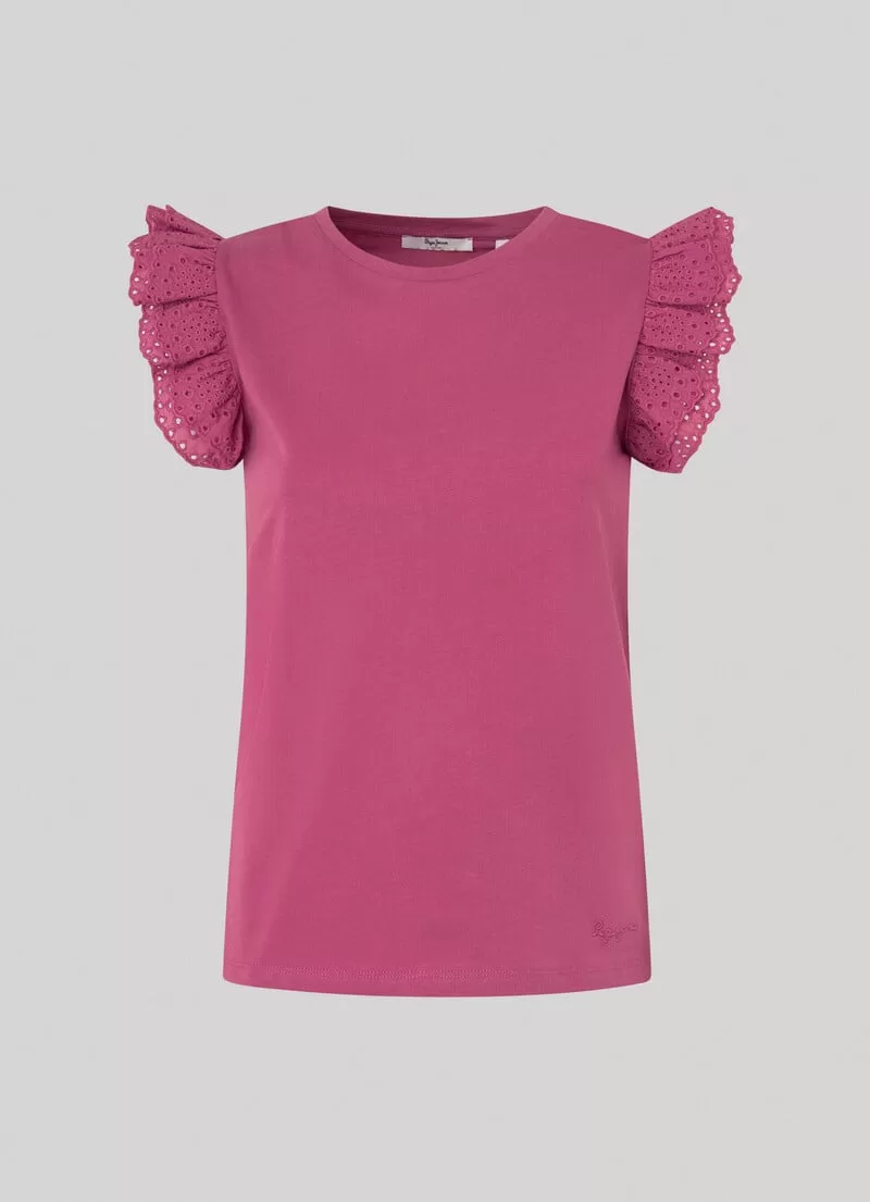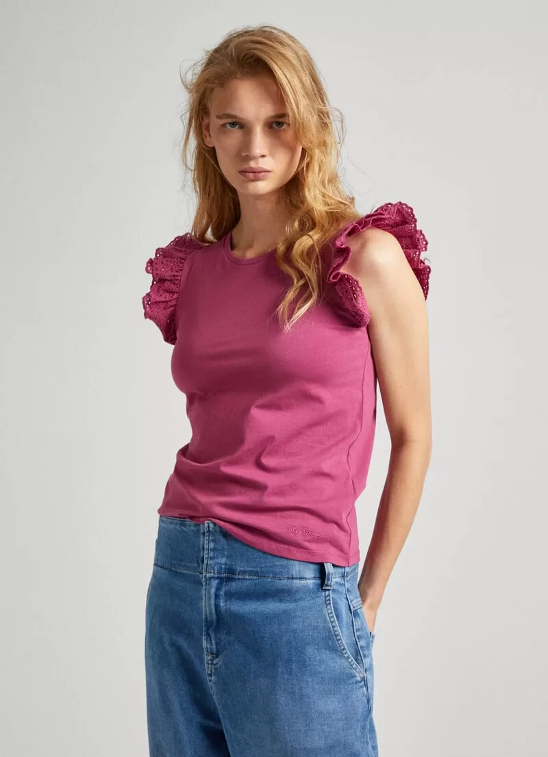 T-shirt em tecido jersey de algodão. Regular fit. Gola redonda. Manga cavada com folhos duplos bordados. Cor lisa. Logo PEPEJEANS bordado na bainha. Acabamento de costura dupla na bainha. COMPOSIÇÃO: 100% Algodão.