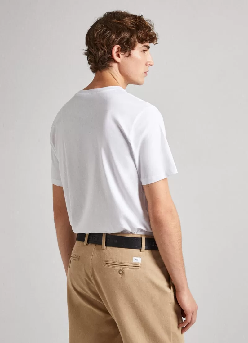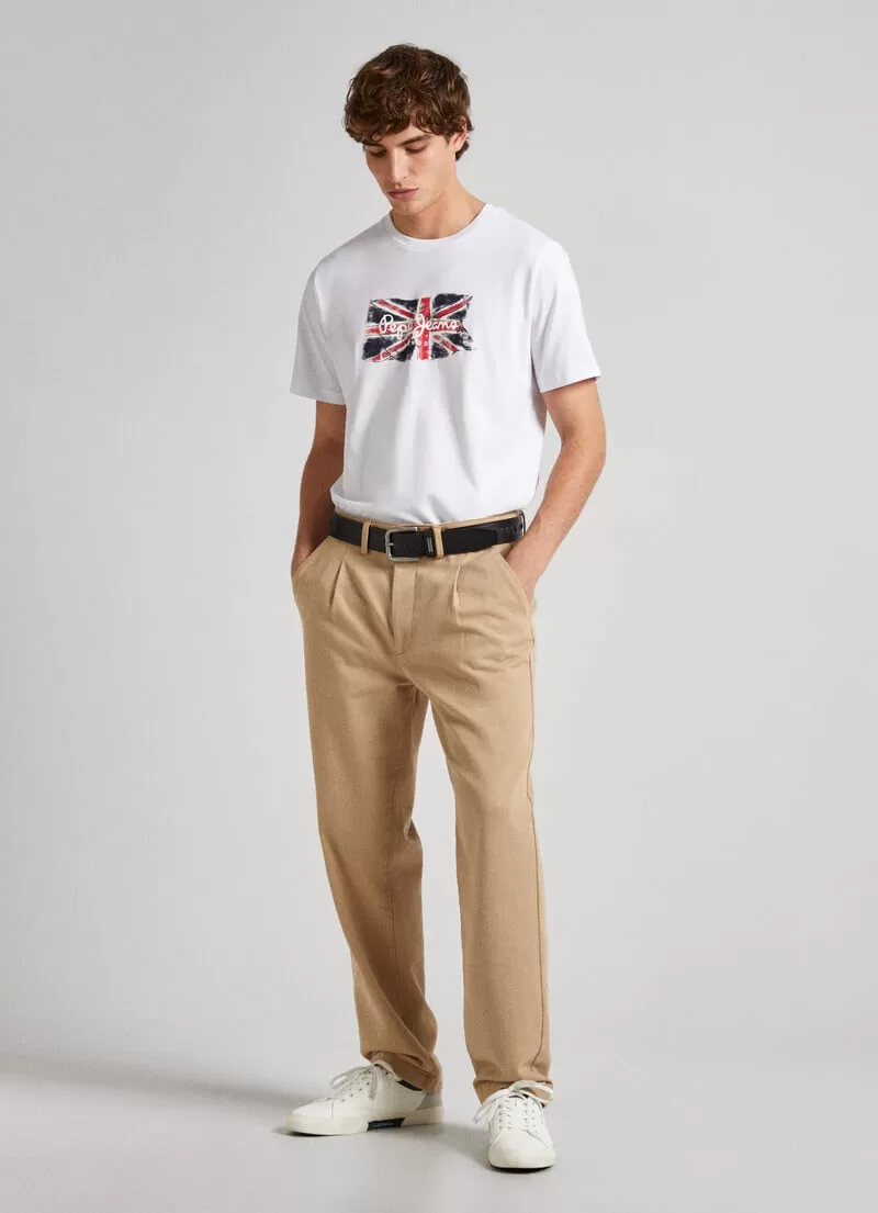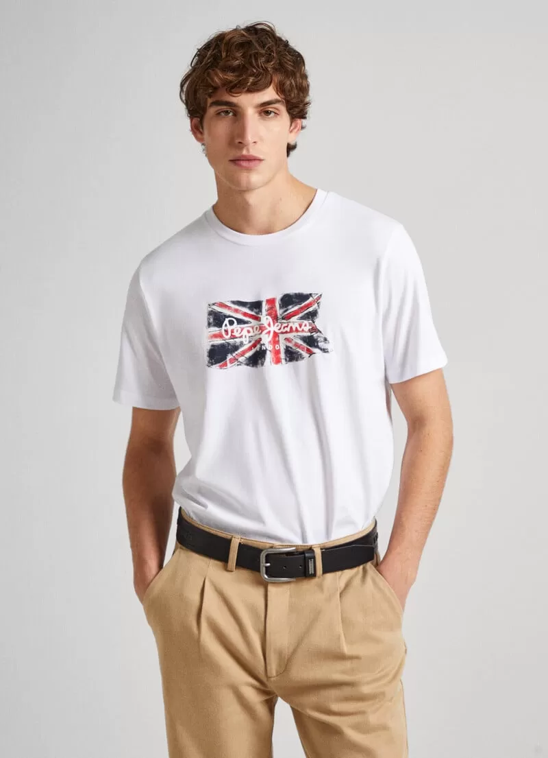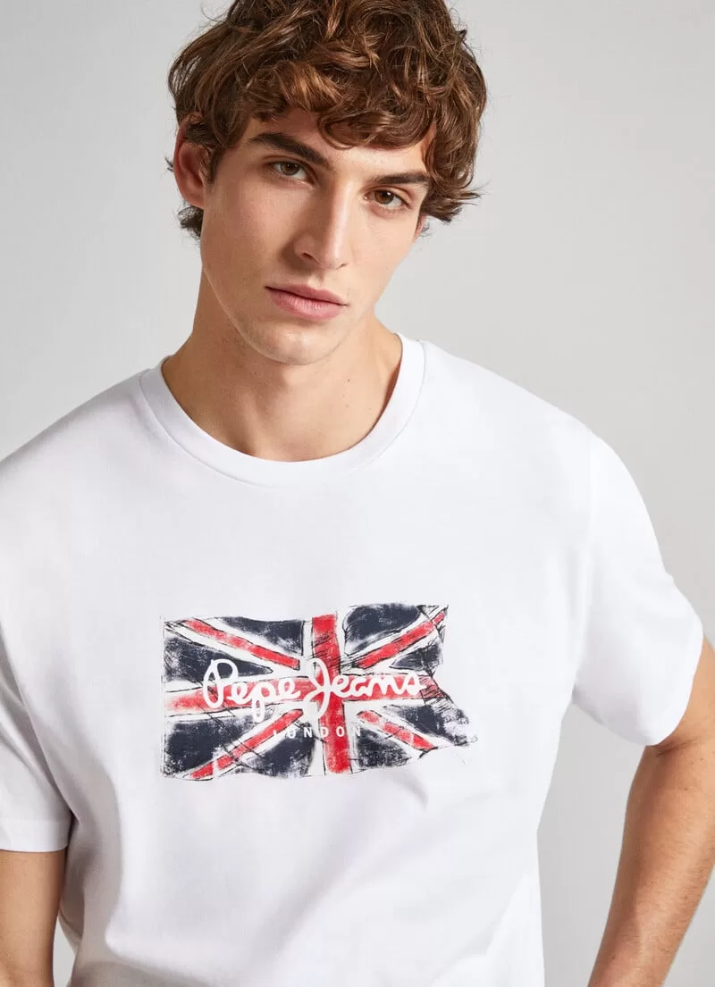 T-shirt em jersey de algodão. Regular fit. Manga curta. Gola redonda. Bandeira Union Jack estampada na parte frontal. Logo PEPEJEANS estampado sobre a bandeira. Detalhe canelado na gola. Acabamento de costura dupla nas mangas e bainha. Fabricada com 100% algodão sustentável. COMPOSIÇÃO: 100% Algodão.