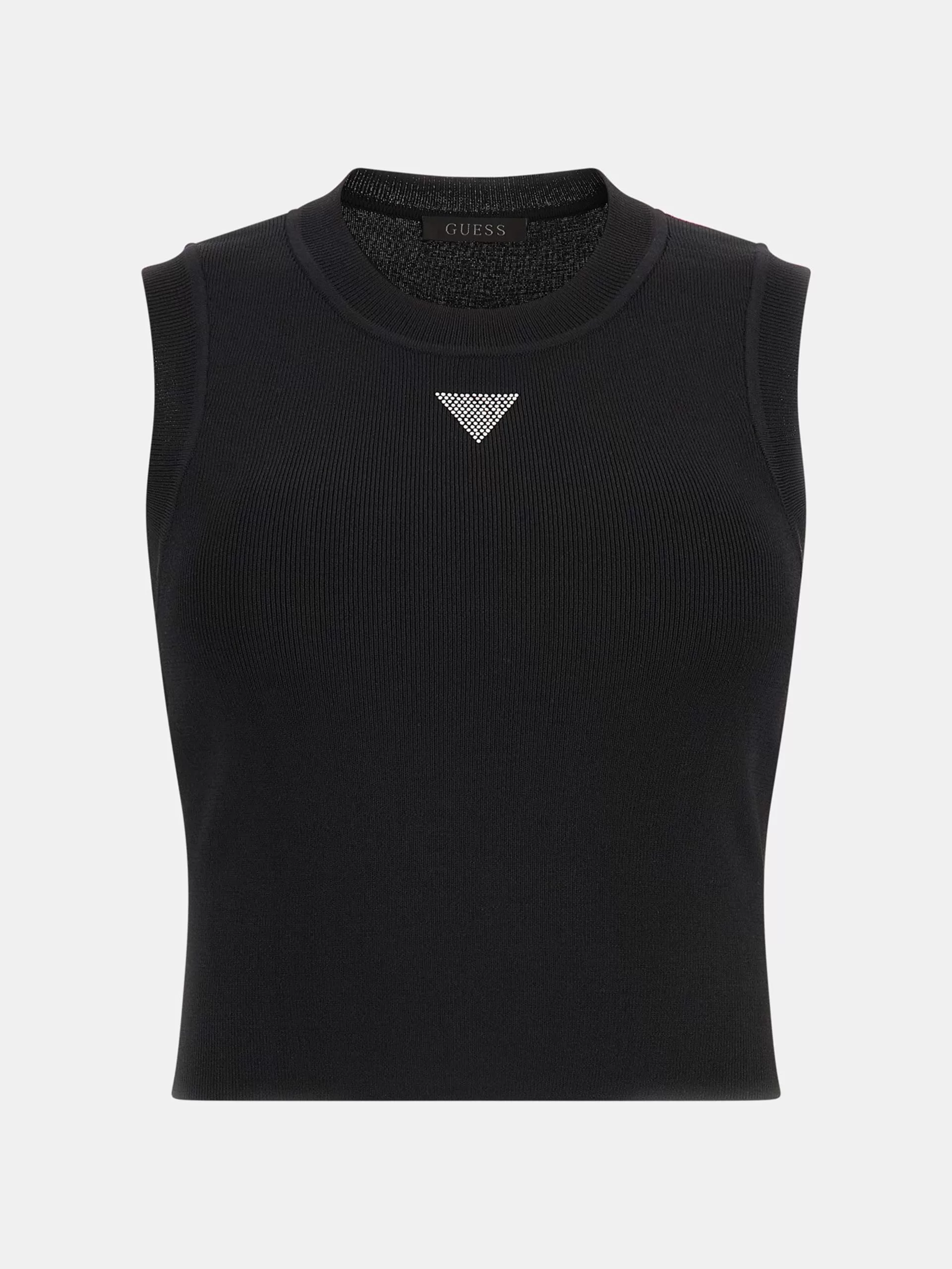Top de malha em mistura de viscose. Gola redonda. Sem mangas. Slim fit. DETALHES: Logo triângulo com strass. COMPOSIÇÃO DO TECIDO PRINCIPAL: 79% Viscose, 18% Poliamida, 3% Elastano.