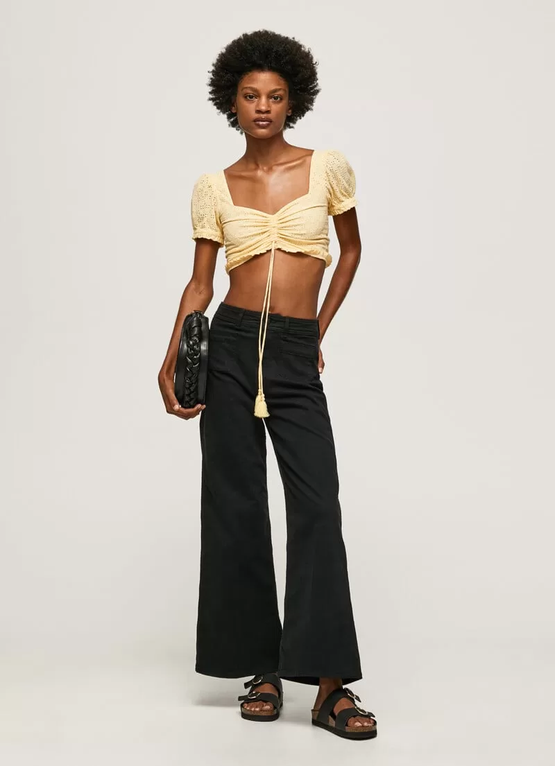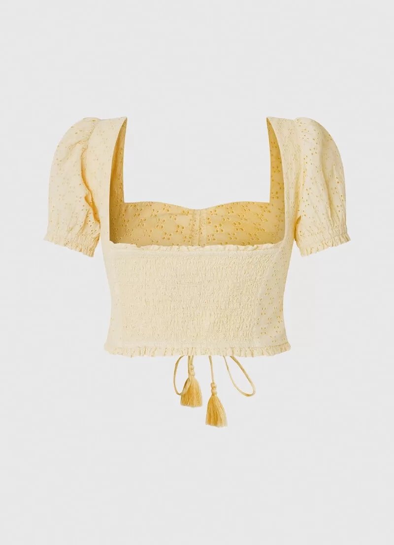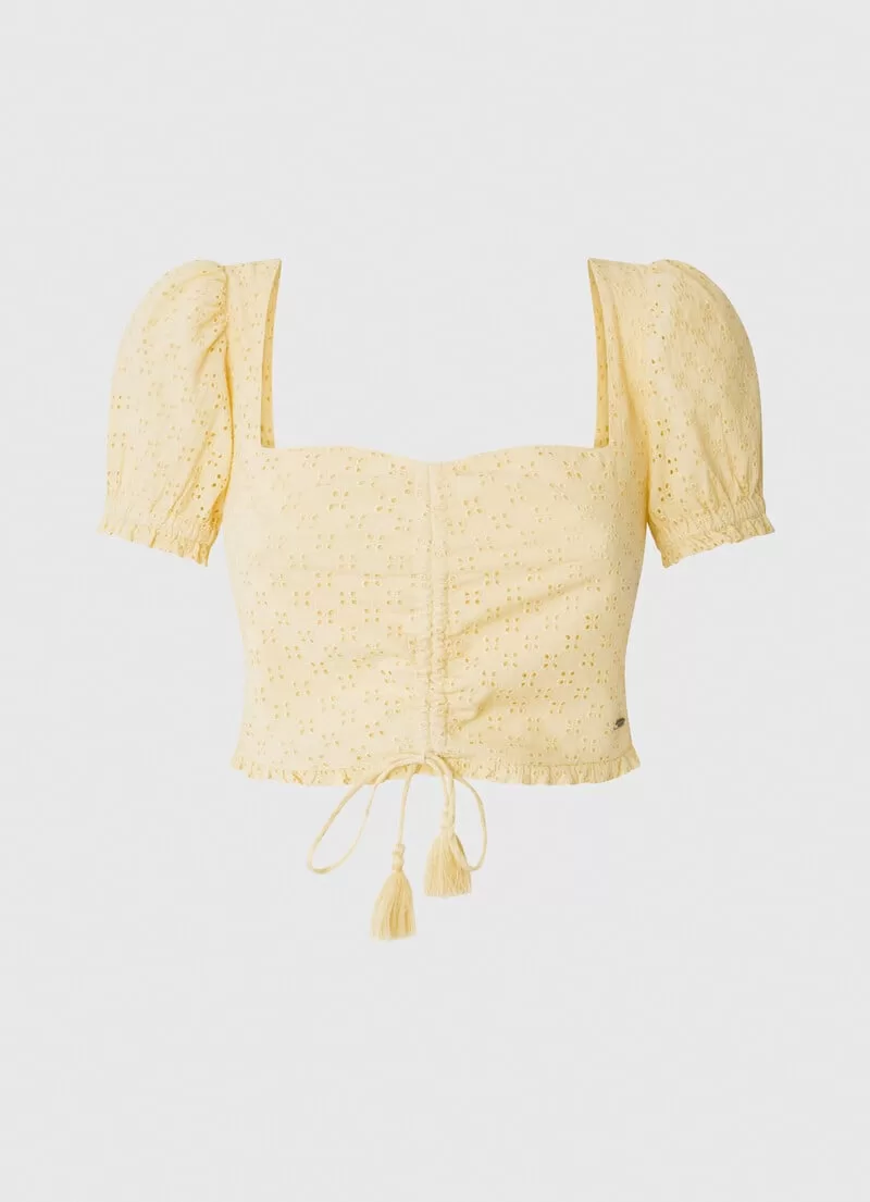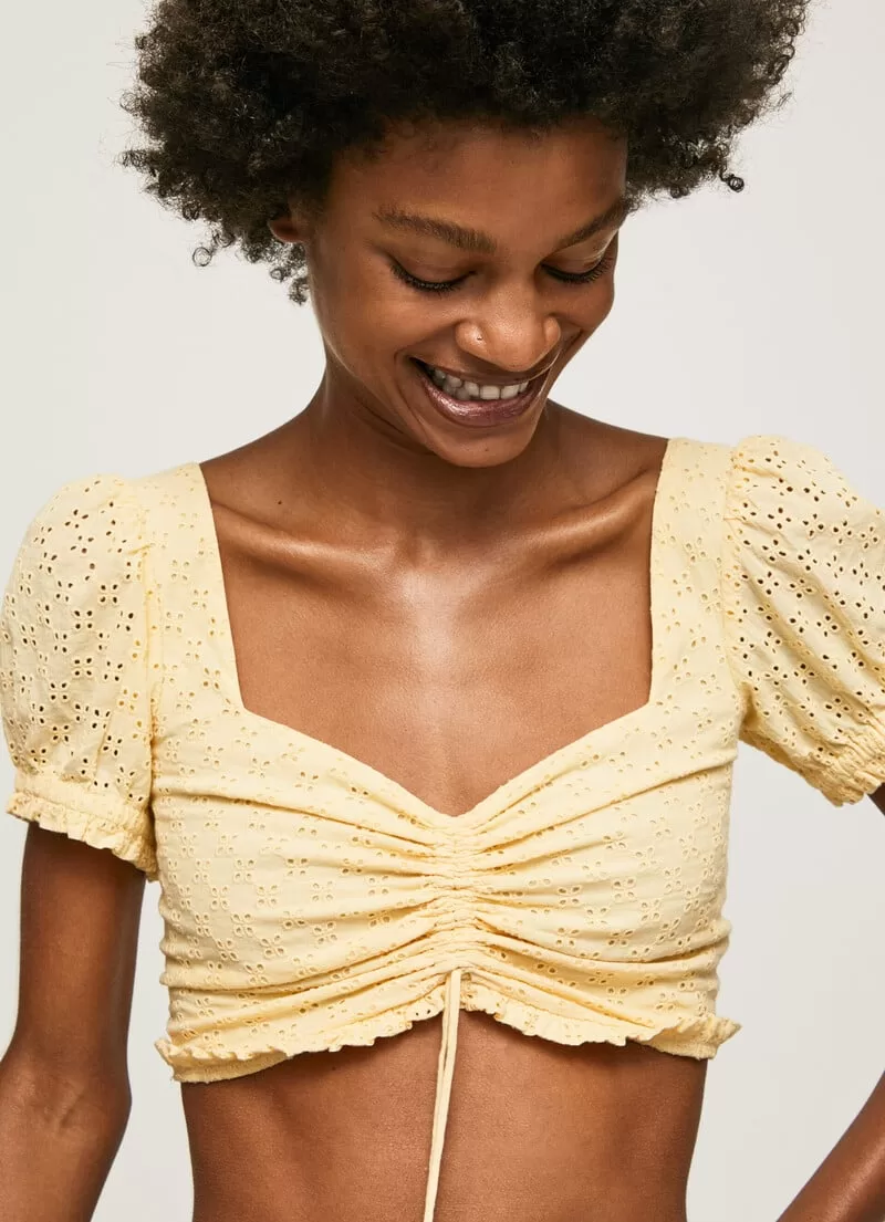 Top em tecido de algodão Cropped fit Decote quadrado com franzido no centro Laço frontal ajustável com detalhe de borlas Manga curta com elástico e mini folhos Detalhe bordado all over Painel traseiro elástico com detalhes franzidos Bainha franzida Placa de metal com logo gravado na parte inferior. COMPOSIÇÃO: 100% Algodão.