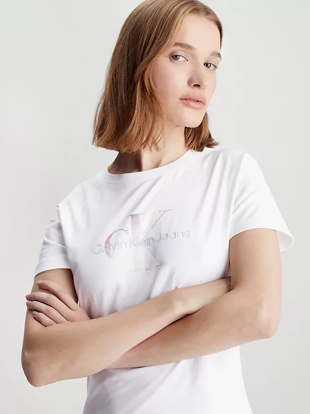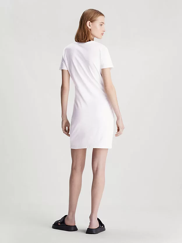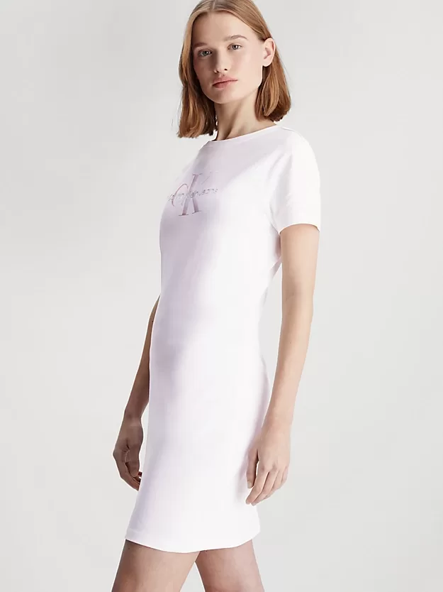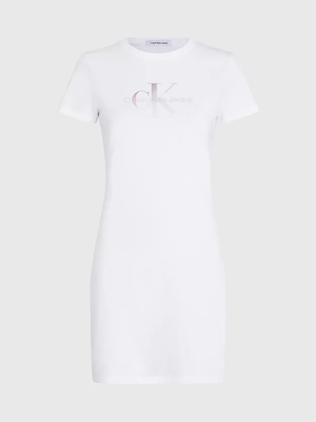 Vestido elástico de algodão. Tamanho normal. Decote redondo. Manga curta. Logotipo iridescente da Calvin Klein no peito. Composição: 94% algodão regenerativo 6% elastano.