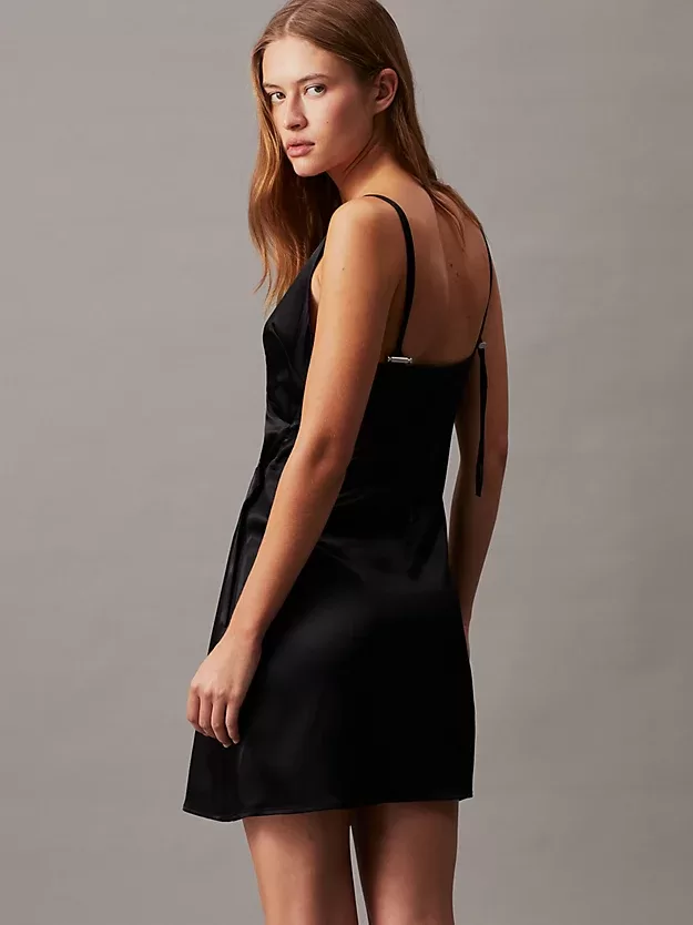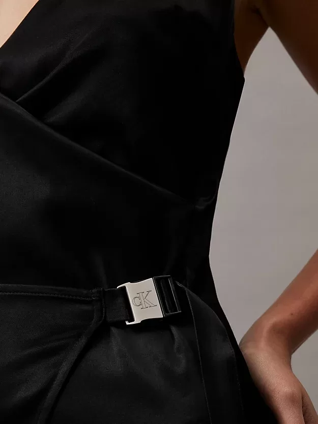 Vestido de cetim elástico de viscose. Estilo justo, sem mangas. Frente envolvente. Fivela ajustável no quadril. Aças duplas com ajustadores. Sem forro, slip-on. Ferragens da marca Calvin Klein. Composição: 96% viscose 4% elastano.