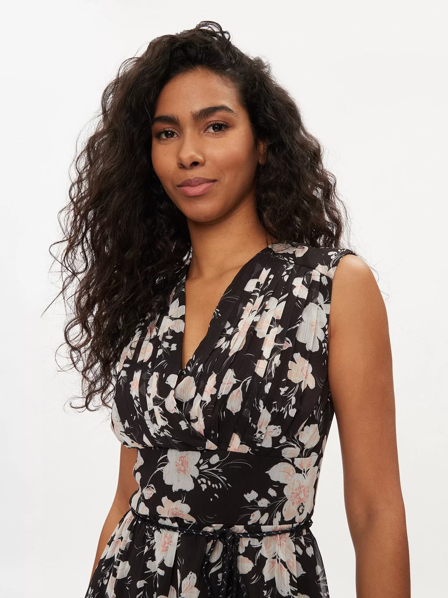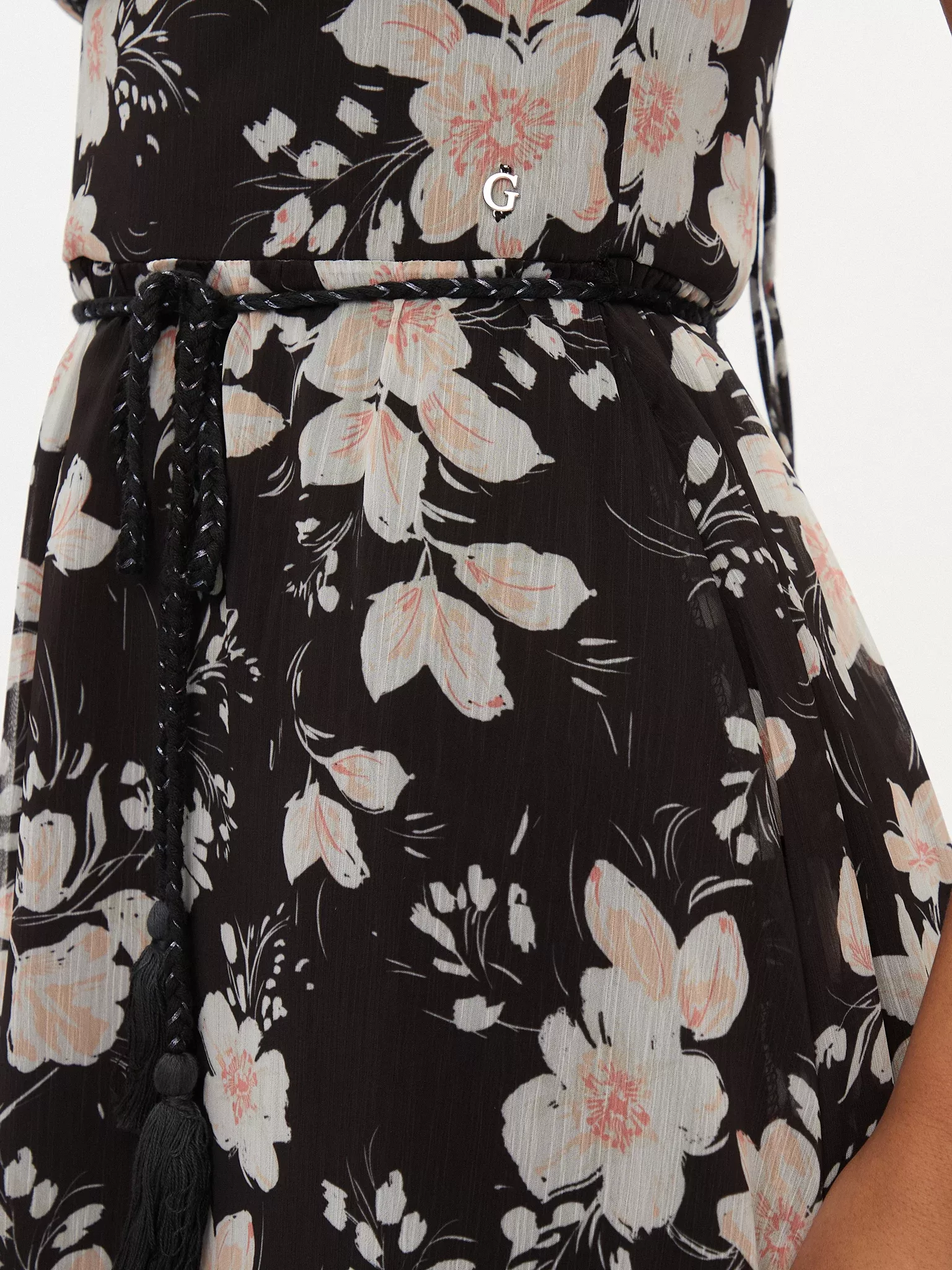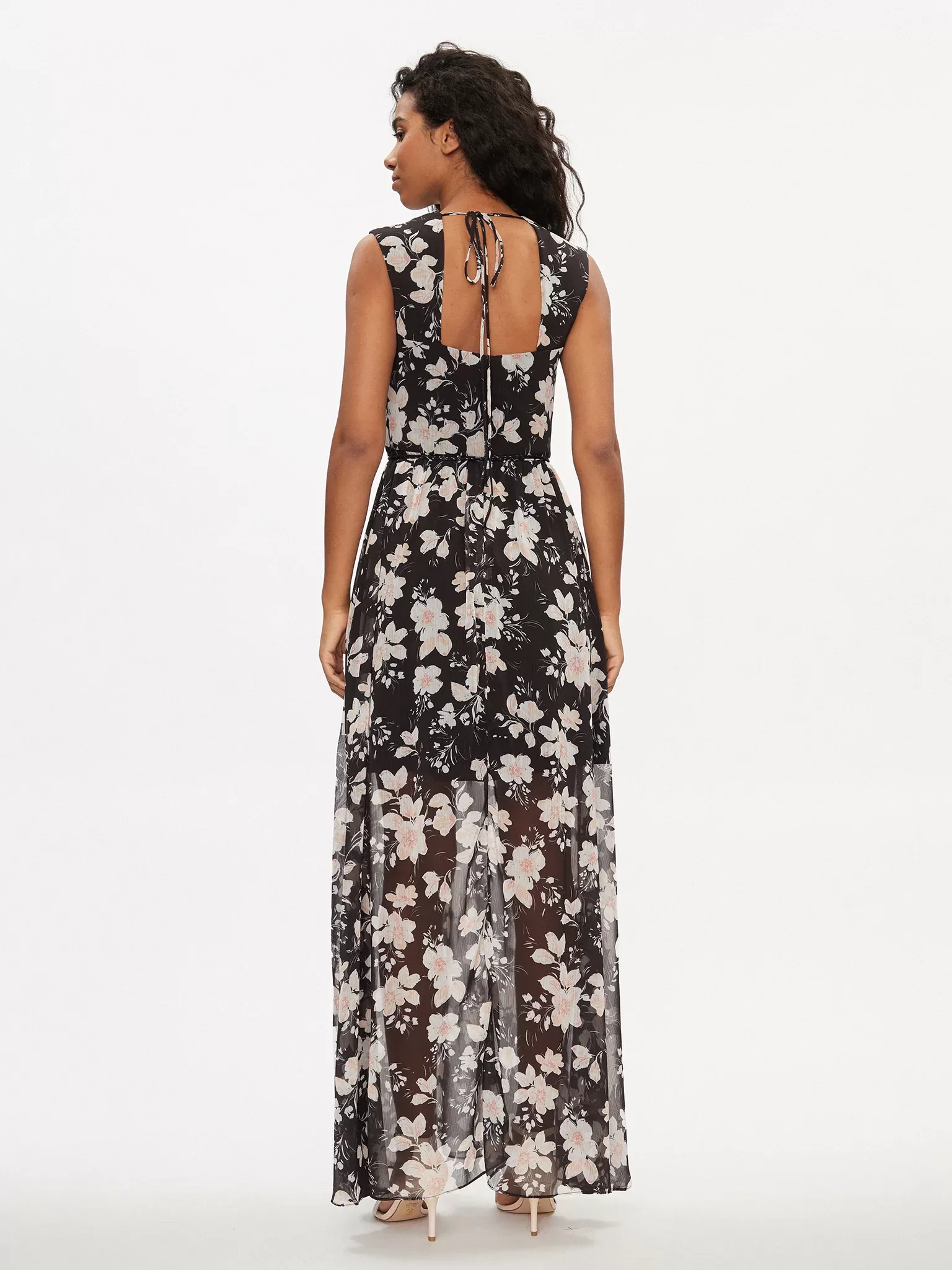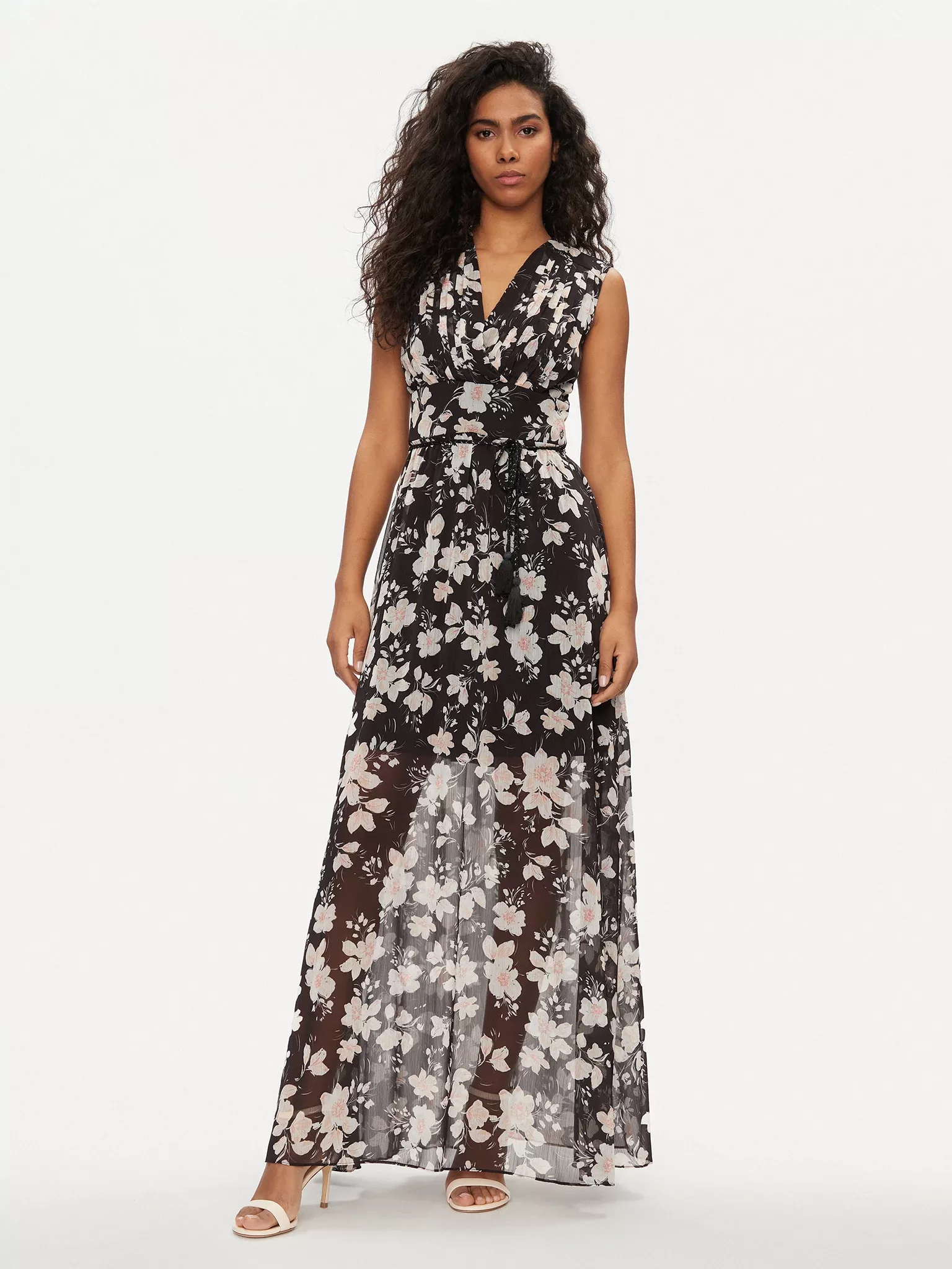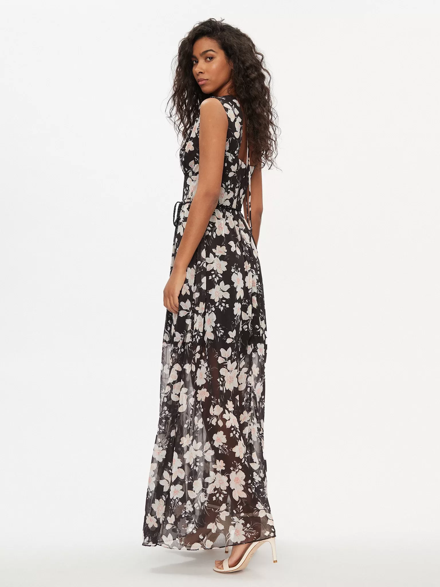 Vestido comprido de tecido sintético. Decote em V. Sem mangas. Relaxed fit. Fecho de correr atrás e atilho. TIPO DE TECIDO: Chiffon. DETALHES DO TECIDO: Padrão total floral. DETALHES: Mini cinto. A imagem mostra o tamanho S. Comprimento total: 124 cm / 48,82 pol. Correspondência de tamanhos.