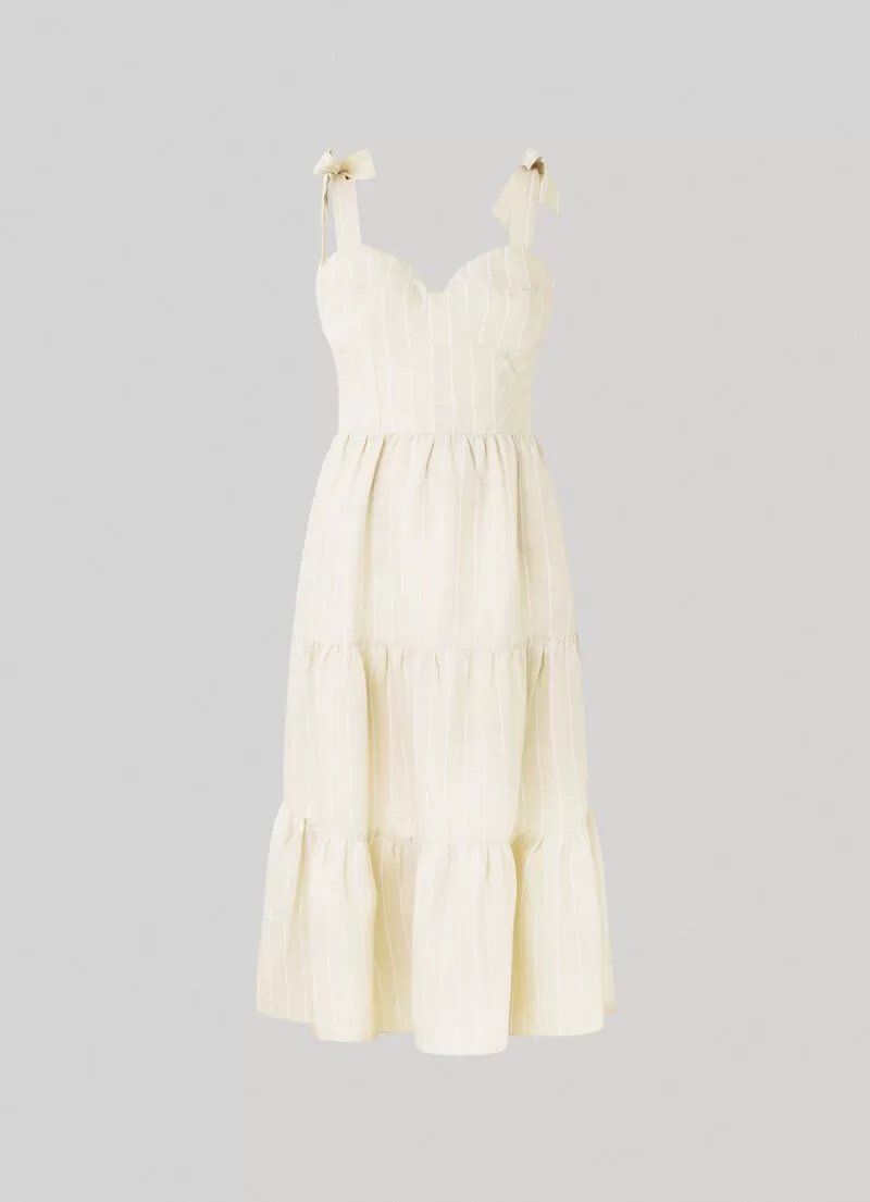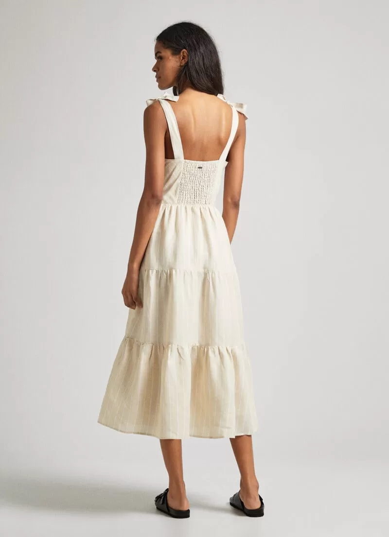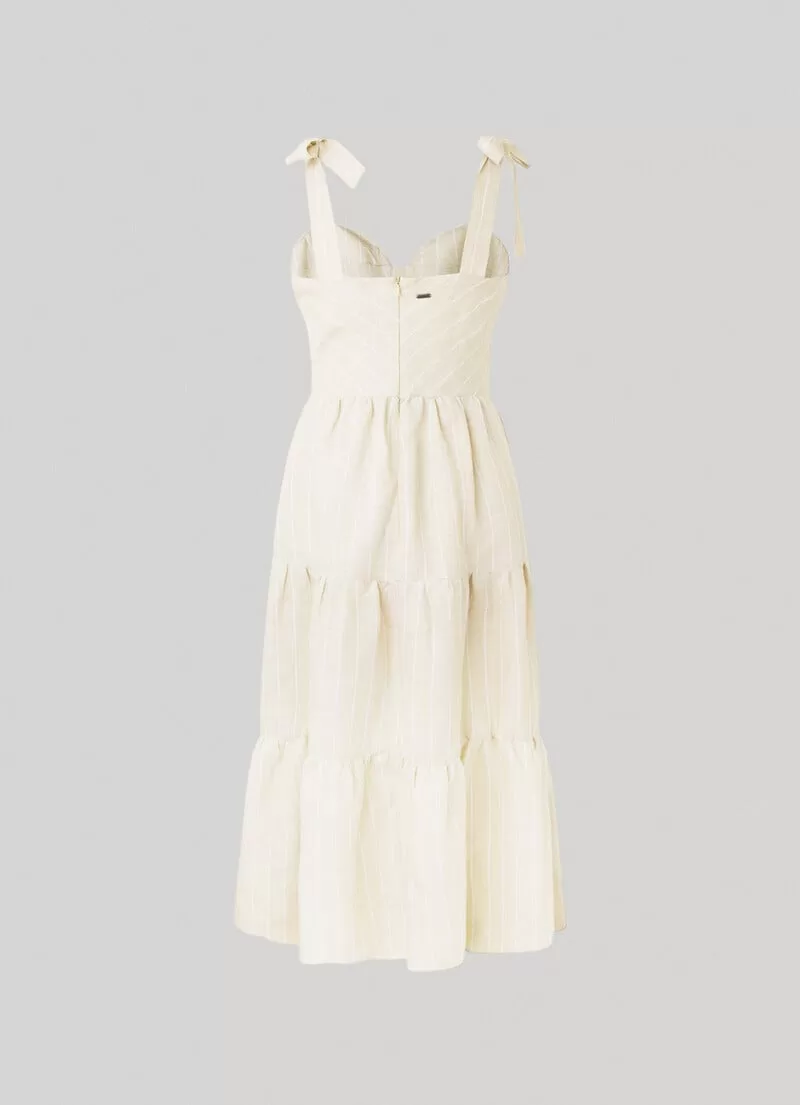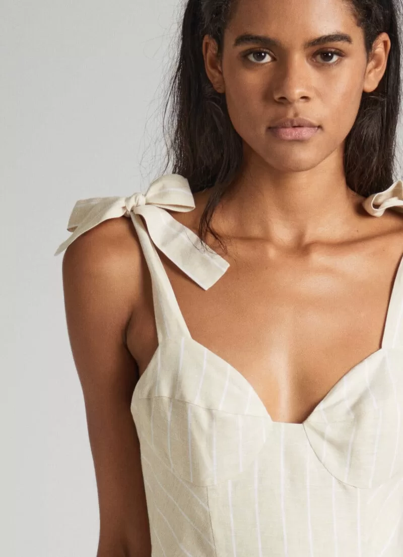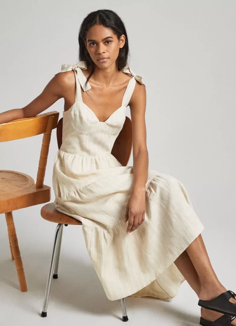 Vestido midi em tecido de linho fluido. Decote coração. Alças ajustáveis. Corpete estilo espartilho. Cintura ajustada. Fecho de correr invisível na parte de trás. Padrão às riscas verticais. Placa metálica com logo PEPEJEANS na parte de trás. COMPOSIÇÃO: 51% Linen, 49% Viscose.