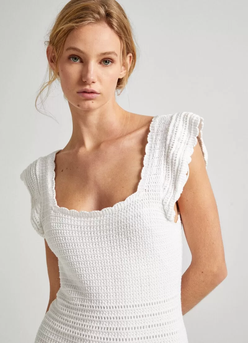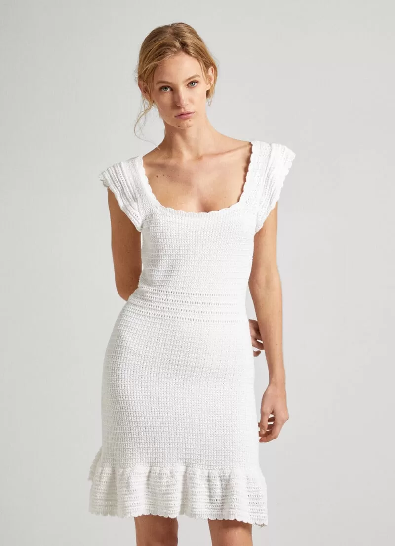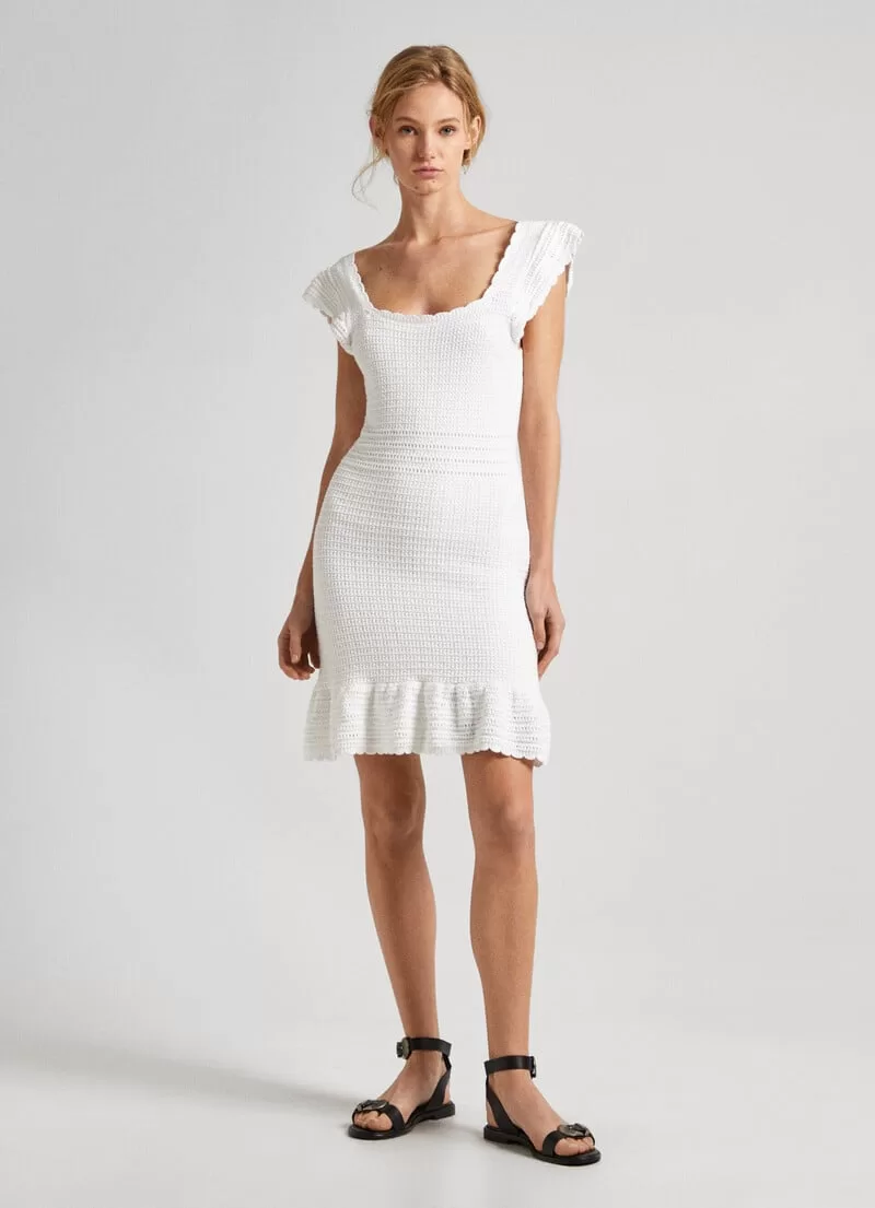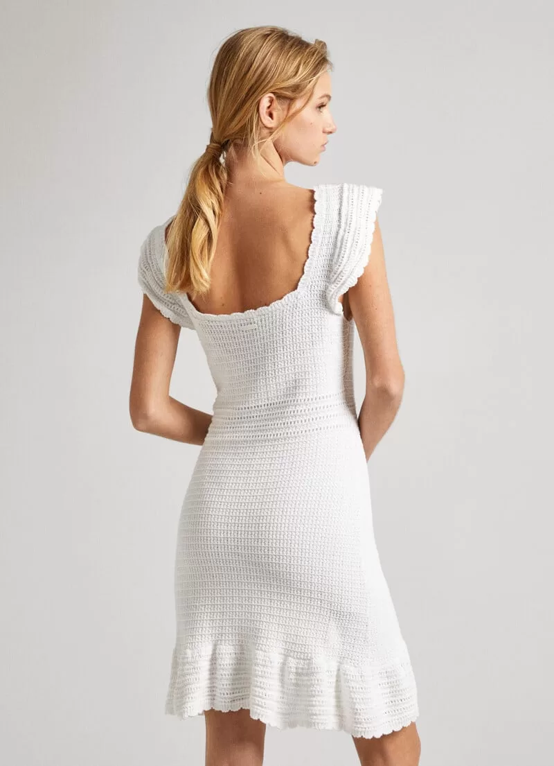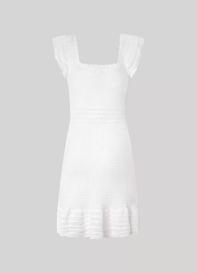 Vestido curto de malha de croché. Decote quadrado com mini folhos. Manga borboleta. Cintura ajustada. Folhos na parte inferior. COMPOSIÇÃO: 100% Algodão.